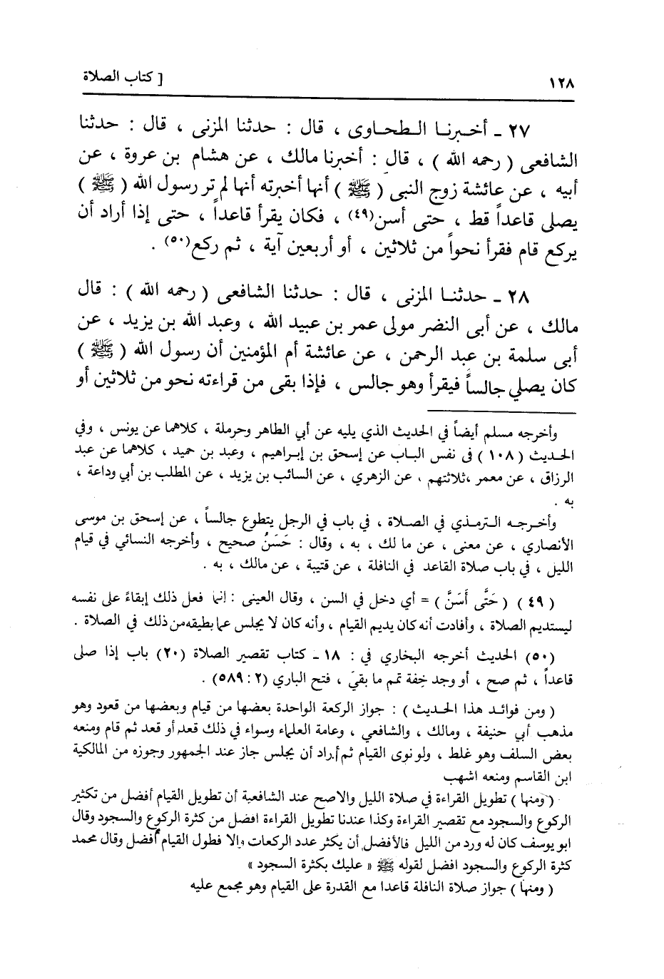 28 - مَالِكٌ، عَنْ أَبِي النَّضْرِ مَوْلَى عُمَرَ بْنِ عُبَيْدِ اللَّهِ , وَعَبْدِ اللَّهِ بْنِ يَزِيدَ , عَنْ أَبِي سَلَمَةَ بْنِ عَبْدِ الرَّحْمَنِ، عَنْ عَائِشَةَ أُمِّ الْمُؤْمِنِينَ، أَنَّ رَسُولَ اللَّهِ صَلَّى اللهُ عَلَيْهِ وَسَلَّمَ كَانَ §يُصَلِّي جَالِسًا فَيَقْرَأُ وَهُوَ جَالِسٌ , فَإِذَا بَقِيَ مِنْ قِرَاءَتِهِ قَدْرُ مَا يَكُونُ ثَلَاثِينَ , أَوْ -[129]- أَرْبَعِينَ آيَةً قَامَ فَقَرَأَ وَهُوَ قَائِمٌ , ثُمَّ رَكَعَ , ثُمَّ سَجَدَ , ثُمَّ يَفْعَلُ فِي الرَّكْعَةِ الثَّانِيَةِ مِثْلَ ذَلِكَ
