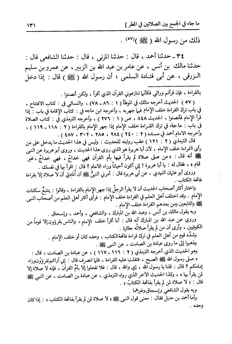 34 - حَدَّثَنَا مَالِكُ بْنُ أَنَسٍ، عَنْ عَامِرِ بْنِ عَبْدِ اللَّهِ بْنِ الزُّبَيْرِ، عَنْ عَمْرِو بْنِ سُلَيْمٍ الزُّرَقِيِّ، عَنْ أَبِي قَتَادَةَ السُّلَمِيِّ، أَنَّ رَسُولَ اللَّهِ صَلَّى اللهُ عَلَيْهِ وَسَلَّمَ قَالَ: «§إِذَا دَخَلَ -[132]- أَحَدُكُمُ الْمَسْجِدَ فَلْيَرْكَعْ رَكْعَتَيْنِ قَبْلَ أَنْ يَجْلِسَ»