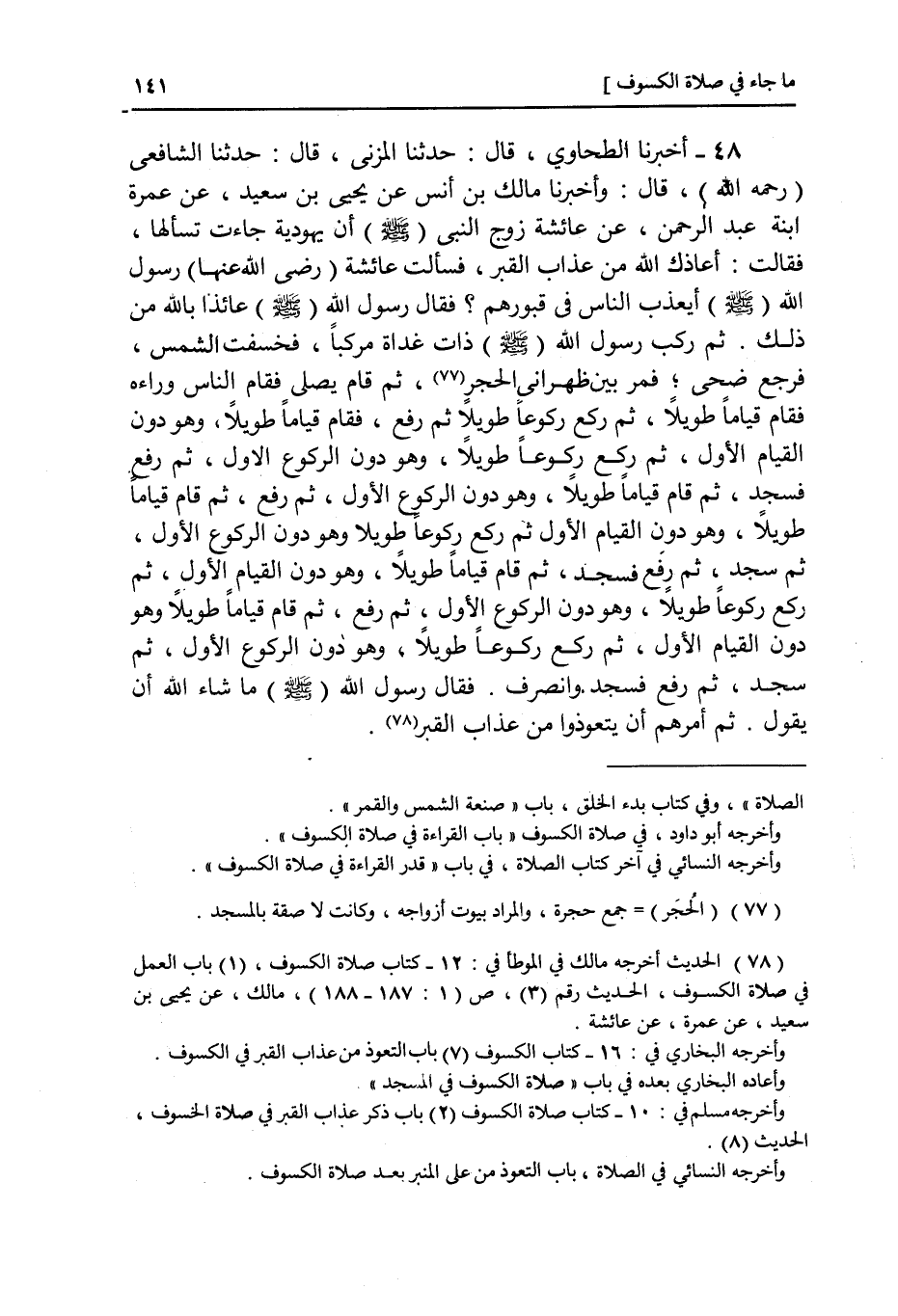 48 - وَأَنْبَأَنَا مَالِكُ بْنُ أَنَسٍ، عَنْ يَحْيَى بْنِ سَعِيدٍ، عَنْ عَمْرَةَ ابْنَةِ عَبْدِ الرَّحْمَنِ، عَنْ عَائِشَةَ، زَوْجِ النَّبِيِّ صَلَّى اللهُ عَلَيْهِ وَسَلَّمَ أَنْ يَهُودِيَّةً جَاءَتْ تَسْأَلُهَا , فَقَالَتْ: أَعَاذَكِ اللَّهُ مِنْ عَذَابِ الْقَبْرِ , فَسَأَلَتْ عَائِشَةُ رَضِيَ اللَّهُ عَنْهَا رَسُولَ اللَّهِ صَلَّى اللهُ عَلَيْهِ وَسَلَّمَ: أَيُعَذَّبُ النَّاسُ فِي قُبُورِهِمْ؟ فَقَالَ رَسُولُ اللَّهِ صَلَّى اللهُ عَلَيْهِ وَسَلَّمَ: «عَائِذًا بِاللَّهِ مِنْ ذَلِكَ» ثُمَّ رَكِبَ رَسُولُ اللَّهِ صَلَّى اللهُ عَلَيْهِ وَسَلَّمَ ذَاتَ غَدَاةٍ مَرْكَبًا , فَخَسَفَتِ الشَّمْسُ ضُحًى , فَخَرَجَ فَمَرَّ بَيْنَ ظَهْرَيِ الْحُجَرِ , ثُمَّ قَامَ يُصَلِّي , فَقَامَ النَّاسُ وَرَاءَهُ ,