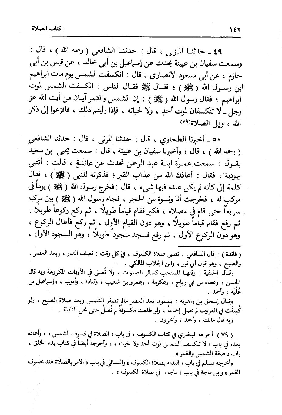 49 - وَسَمِعْتُ سُفْيَانَ بْنَ عُيَيْنَةَ، يُحَدِّثُ عَنْ إِسْمَاعِيلَ بْنِ أَبِي خَالِدٍ، عَنْ قَيْسِ بْنِ أَبِي حَازِمٍ، عَنْ أَبِي مَسْعُودٍ الْأَنْصَارِيِّ، قَالَ: انْكَسَفَتِ الشَّمْسُ يَوْمَ مَاتَ إِبْرَاهِيمُ ابْنُ رَسُولِ اللَّهِ صَلَّى اللهُ عَلَيْهِ وَسَلَّمَ , فَقَالَ النَّاسُ: كَسَفَتِ الشَّمْسُ لِمَوْتِ إِبْرَاهِيمَ , فَقَالَ رَسُولُ اللَّهِ صَلَّى اللهُ عَلَيْهِ وَسَلَّمَ: «إِنَّ §الشَّمْسَ وَالْقَمَرَ آيَتَانِ مِنْ آيَاتِ اللَّهِ عَزَّ وَجَلَّ , لَا يَنْكَسِفَانِ لِمَوْتِ أَحَدٍ وَلَا لِحَيَاتِهِ , فَإِذَا رَأَيْتُمْ ذَلِكَ فَافْزَعُوا إِلَى ذِكْرِ اللَّهِ وَإِلَى الصَّلَاةِ»