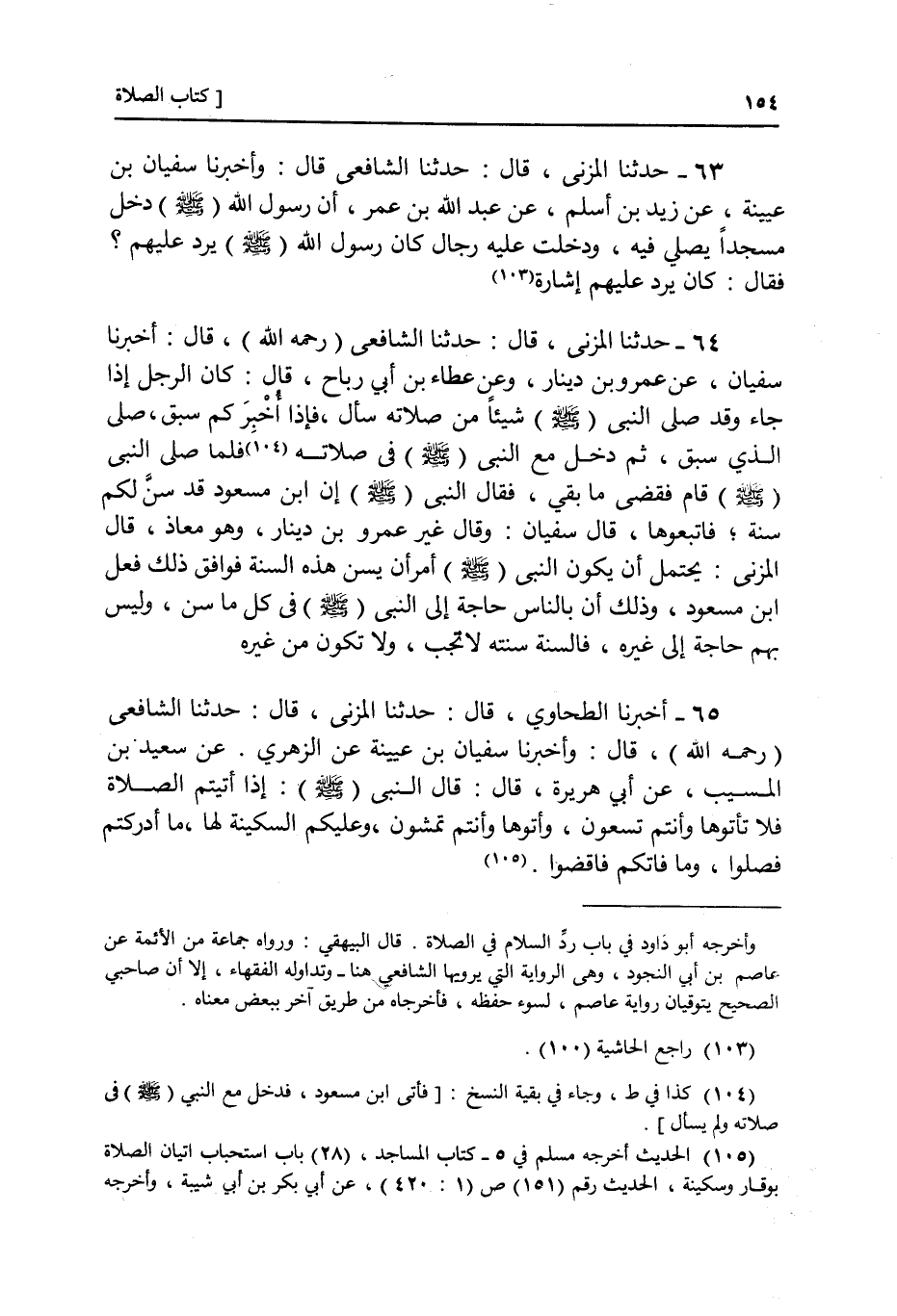 64 - أَنْبَأَنَا سُفْيَانُ بْنُ عُيَيْنَةَ، عَنْ عَمْرِو بْنِ دِينَارٍ، عَنْ عَطَاءِ بْنِ أَبِي رَبَاحٍ، قَالَ: كَانَ الرَّجُلُ إِذَا جَاءَ وَقَدْ صَلَّى النَّبِيُّ صَلَّى اللهُ عَلَيْهِ وَسَلَّمَ شَيْئًا مِنْ صَلَاتِهِ سَأَلَ , فَإِذَا أُخْبِرَ كَمْ سُبِقَ صَلَّى الَّذِي سُبِقَ , ثُمَّ دَخَلَ مَعَ النَّبِيِّ صَلَّى اللهُ عَلَيْهِ وَسَلَّمَ فِي صَلَاتِهِ , فَأَتَى ابْنُ مَسْعُودٍ , فَدَخَلَ مَعَ النَّبِيِّ صَلَّى اللهُ عَلَيْهِ وَسَلَّمَ فِي صَلَاتِهِ وَلَمْ يَسْأَلْ , فَلَمَّا صَلَّى النَّبِيُّ صَلَّى اللهُ عَلَيْهِ وَسَلَّمَ قَامَ فَقَضَى مَا بَقِيَ , فَقَالَ النَّبِيُّ صَلَّى اللهُ عَلَيْهِ وَسَلَّمَ: «إِنَّ §ابْنَ مَسْعُودٍ قَدْ سَنَّ لَكُمْ سُنَّةً فَاتَّبِعُوهَا» . قَالَ سُفْيَانُ: وَقَالَ غَيْرُ عَمْرٍو: هُوَ مُعَاذٌ. قَالَ الْمُزَنِيُّ: يُحْتَمَلُ أَنْ يَكُونَ النَّبِيُّ صَلَّى اللهُ عَلَيْهِ وَسَلَّمَ أُمِرَ أَنْ يَسُنَّ هَذِهِ السُّنَّةَ , فَوَافَقَ ذَلِكَ فِعْلَ ابْنِ مَسْعُودٍ , وَذَلِكَ أَنَّ بِالنَّاسِ حَاجَةً إِلَى النَّبِيِّ صَلَّى اللهُ عَلَيْهِ وَسَلَّمَ فِي كُلِّ مَا سَنَّ , وَلَيْسَ بِهِمْ حَاجَةٌ إِلَى غَيْرِهِ , فَالسُّنَّةُ سُنَّتُهُ , لَا تَجِبُ وَلَا تَكُونُ مِنْ غَيْرِهِ