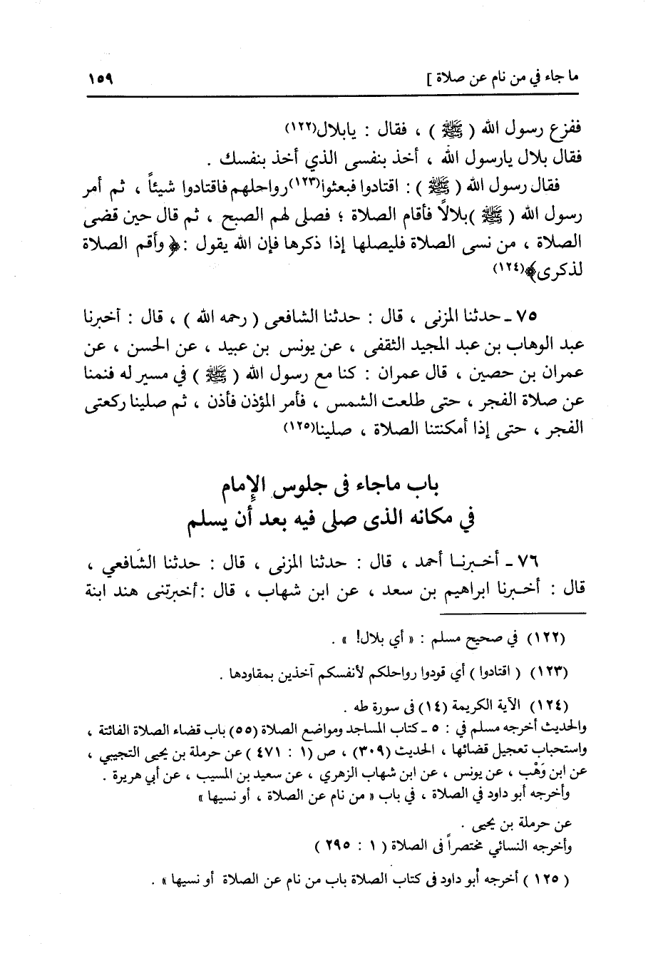 75 - حَدَّثَنَا عَبْدُ الْوَهَّابِ بْنُ عَبْدِ الْمَجِيدِ الثَّقَفِيُّ، عَنْ يُونُسَ بْنِ عُبَيْدٍ، عَنِ الْحَسَنِ، عَنْ عِمْرَانَ بْنِ حُصَيْنٍ، قَالَ عِمْرَانُ: كُنَّا مَعَ رَسُولِ اللَّهِ صَلَّى اللهُ عَلَيْهِ وَسَلَّمَ فِي مَسِيرٍ لَهُ §فَنِمْنَا عَنْ صَلَاةِ الْفَجْرِ حَتَّى طَلَعَتِ الشَّمْسُ فَأَمَرَ الْمُؤَذِّنَ فَأَذَّنَ ثُمَّ صَلَّيْنَا رَكْعَتَيِ الْفَجْرِ حَتَّى إِذَا أَمْكَنَتْنَا الصَّلَاةُ صَلَّيْنَا