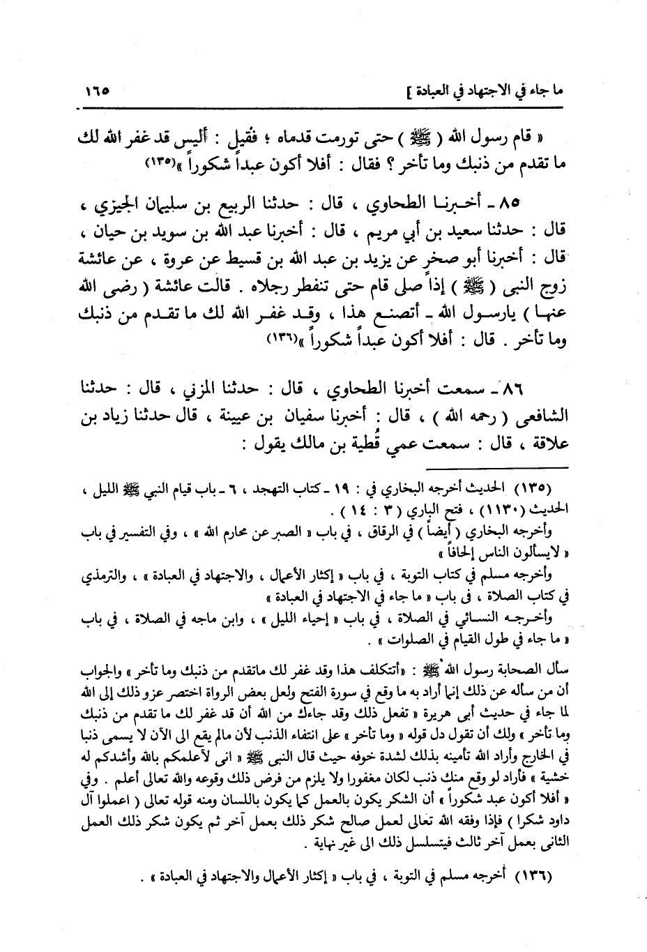85 - أَخْبَرَنَا الطَّحَاوِي، قَالَ حَدثنَا الرَّبِيعُ بْنُ سُلَيْمَانَ الْجِيزِيُّ قَالَ: سَعِيدُ بْنُ أَبِي مَرْيَمَ، قَالَ: أَنْبَأَنَا عَبْدُ اللَّهِ بْنُ سُوَيْدِ بْنِ حَيَّانَ، قَالَ: أَنْبَأَنَا أَبُو صَخْرٍ , عَنْ يَزِيدَ بْنِ عَبْدِ اللَّهِ بْنِ قُسَيْطٍ، عَنْ عُرْوَةَ، عَنْ عَائِشَةَ، زَوْجِ النَّبِيِّ صَلَّى اللهُ عَلَيْهِ وَسَلَّمَ قَالَتْ: كَانَ رَسُولُ اللَّهِ صَلَّى اللهُ عَلَيْهِ وَسَلَّمَ إِذَا صَلَّى قَامَ حَتَّى تَنْفَطِرَ رِجْلَاهُ، قَالَتْ عَائِشَةُ رَضِيَ اللَّهُ عَنْهَا: يَا رَسُولَ اللَّهِ، أَتَصْنَعُ هَذَا وَقَدْ غَفَرَ اللَّهُ لَكَ مَا تَقَدَّمَ مِنْ ذَنْبِكَ وَمَا تَأَخَّرَ قَالَ: «§أَفَلَا أَكُونُ عَبْدًا شَكُورًا»