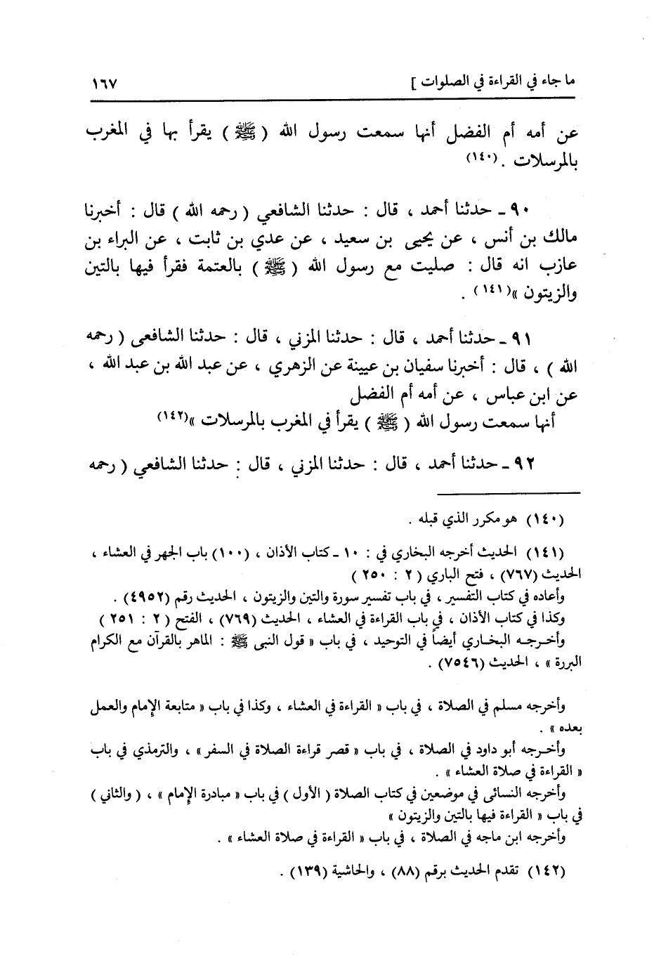 91 - أخبرنَا سُفْيَانُ بن عُيَيْنَة عَن الزُّهْرِيّ عَن عبد الله بن عبد الله عَن ابْن عَبَّاس عَن امهِ ام الْفضل انها سَمِعت رَسُول الله صَلَّى اللهُ عَلَيْهِ وَسَلَّمَ يقْرَأ فِي الْمغرب بالمرسلات