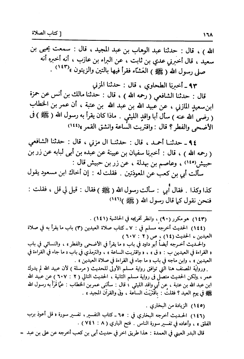 93 - أَنْبَأَنَا مَالِكُ بْنُ أَنَسٍ، عَنْ حَمْزَةَ بْنِ سَعِيدٍ الْمَازِنِيِّ، عَنْ عُبَيْدِ اللَّهِ بْنِ عَبْدِ اللَّهِ بْنِ عُتْبَةَ، أَنَّ عُمَرَ بْنَ الْخَطَّابِ، رَضِيَ اللَّهُ عَنْهُ سَأَلَ أَبَا وَاقِدٍ اللَّيْثِيَّ مَاذَا كَانَ يَقْرَأُ بِهِ رَسُولُ اللَّهِ صَلَّى اللهُ عَلَيْهِ وَسَلَّمَ فِي الْأَضْحَى وَالْفِطْرِ؟ قَالَ: كَانَ §يَقْرَأُ ق وَالْقُرْآنِ الْمَجِيدِ وَاقْتَرَبَتِ السَّاعَةُ وَانْشَقَّ الْقَمَرُ "