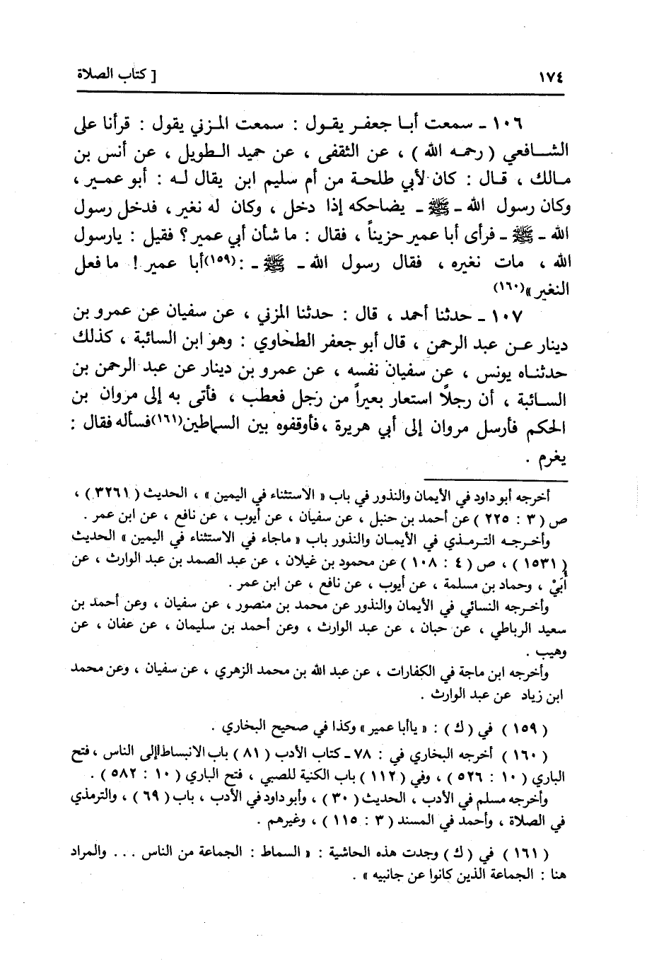 106 - عَنِ الثَّقَفِيِّ , عَنْ حُمَيْدٍ الطَّوِيلِ , عَنْ أَنَسِ بْنِ مَالِكٍ، قَالَ: كَانَ لِأَبِي طَلْحَةَ مِنْ أُمِّ سُلَيْمٍ ابْنٌ يُقَالُ لَهُ: أَبُو عُمَيْرٍ وَكَانَ رَسُولُ اللَّهِ صَلَّى اللهُ عَلَيْهِ وَسَلَّمَ يُضَاحِكُهُ إِذَا دَخَلَ وَكَانَ لَهُ نُغِيرٌ فَدَخَلَ رَسُولُ اللَّهِ صَلَّى اللهُ عَلَيْهِ وَسَلَّمَ فَرَأَى أَبَا عُمَيْرٍ حَزِينًا فَقَالَ: «مَا شَأْنُ أَبِي عُمَيْرٍ؟» فَقِيلَ: يَا رَسُولَ اللَّهِ مَاتَ نُغَيْرُهُ فَقَالَ رَسُولُ اللَّهِ صَلَّى اللهُ عَلَيْهِ وَسَلَّمَ: «§أَبَا عُمَيْرٍ مَا فَعَلَ النُّغَيْرُ؟»