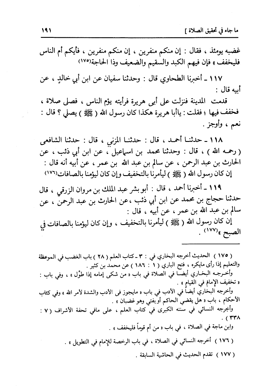 118 - حَدَّثَنَا مُحَمَّدُ بْنُ إِسْمَاعِيلَ، عَنِ ابْنِ أَبِي ذِئْبٍ، عَنِ الْحَارِثِ بْنِ عَبْدِ الرَّحْمَنِ، عَنْ سَالِمِ بْنِ عَبْدِ اللَّهِ بْنِ عُمَرَ، عَنْ أَبِيهِ، أَنَّهُ قَالَ: إِنْ كَانَ رَسُولُ اللَّهِ صَلَّى اللهُ عَلَيْهِ وَسَلَّمَ §لَيَأْمُرُنَا بِالتَّخْفِيفِ وَإِنْ كَانَ لَيَؤُمُّنَا بِالصَّافَّاتِ "