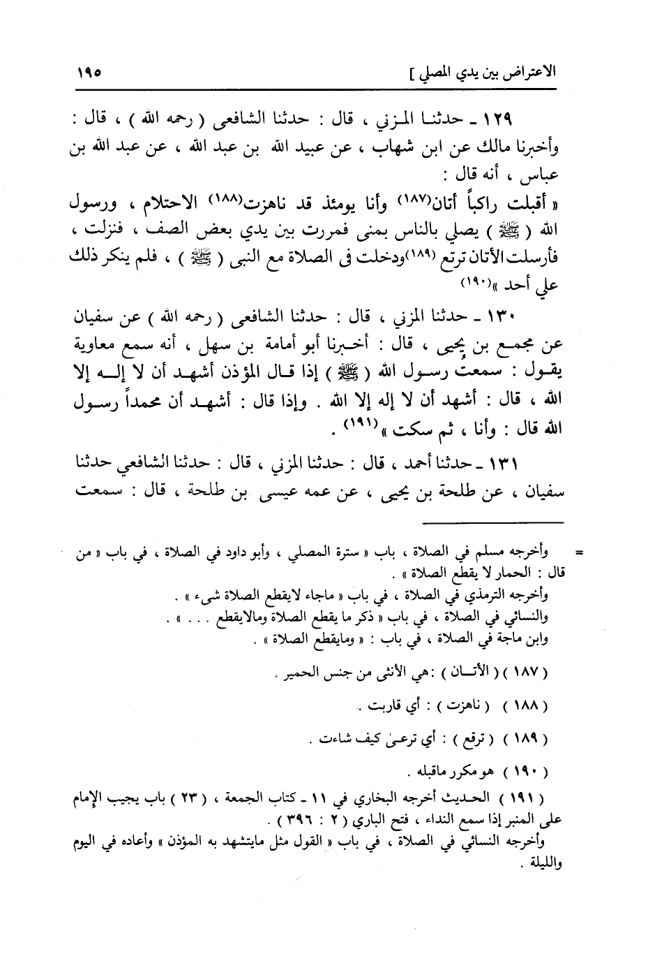 129 - أَنْبَأَنَا مَالِكٌ، عَنِ ابْنِ شِهَابٍ، عَنْ عُبَيْدِ اللَّهِ بْنِ عَبْدِ اللَّهِ، عَنْ عَبْدِ اللَّهِ بْنِ عَبَّاسٍ، أَنَّهُ قَالَ: أَقْبَلْتُ رَاكِبًا عَلَى أَتَانٍ وَأَنَا يَوْمَئِذٍ قَدْ نَاهَزْتُ الِاحْتِلَامَ وَرَسُولُ اللَّهِ صَلَّى اللهُ عَلَيْهِ وَسَلَّمَ يُصَلِّي بِالنَّاسِ بِمِنًى §فَمَرَرْتُ بَيْنَ يَدَيْ بَعْضِ الصَّفِّ فَنَزَلْتُ فَأَرْسَلْتُ الْأَتَانَ تَرْتَعُ وَدَخَلْتُ فِي الصَّلَاةِ مَعَ النَّبِيِّ صَلَّى اللهُ عَلَيْهِ وَسَلَّمَ فَلَمْ يُنْكِرْ ذَلِكَ عَلَيَّ أَحَدٌ "
