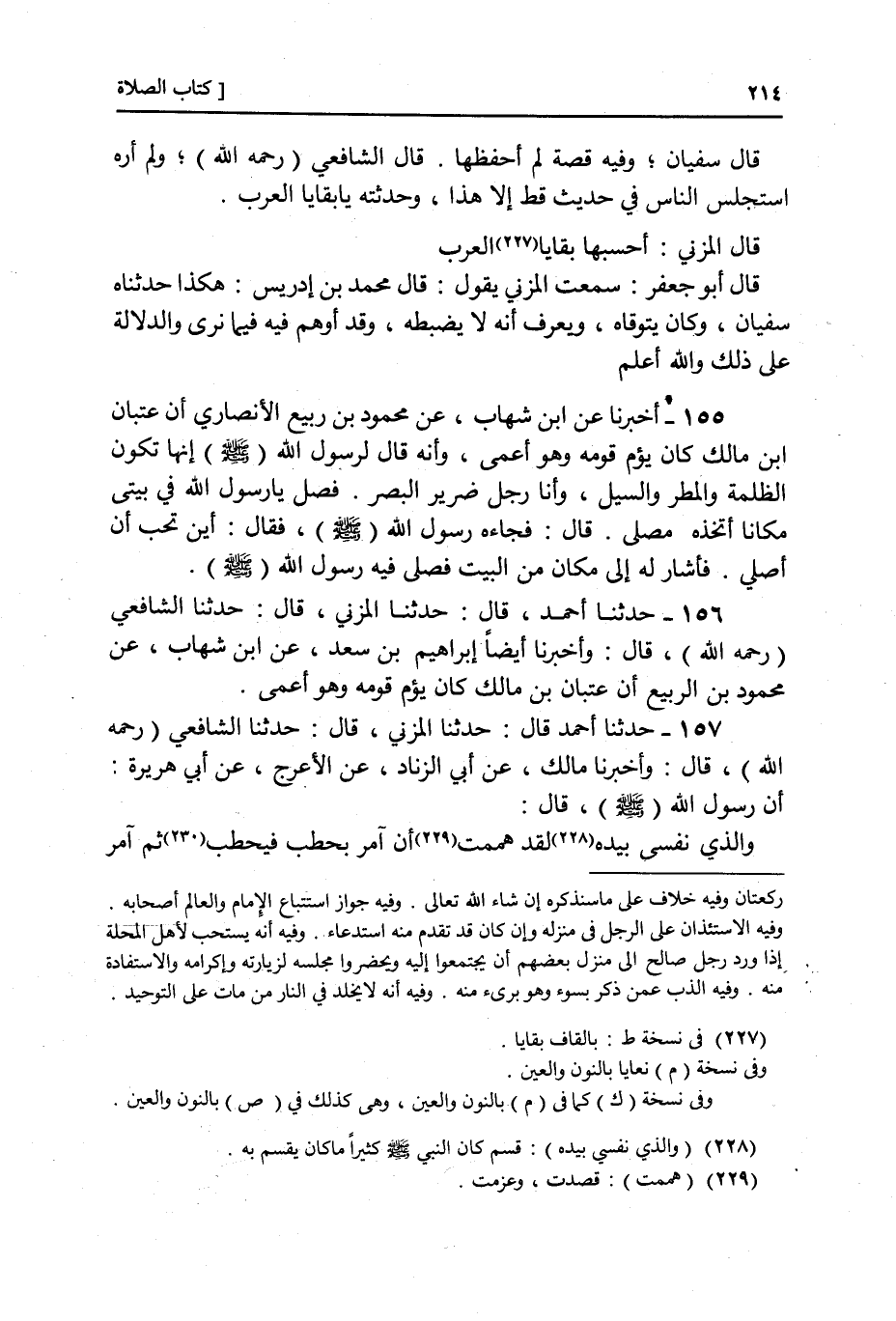 157 - أَنْبَأَنَا مَالِكٌ , عَنْ أَبِي الزِّنَادِ، عَنِ الْأَعْرَجِ، عَنْ أَبِي هُرَيْرَةَ، أَنَّ رَسُولَ اللَّهِ صَلَّى اللهُ عَلَيْهِ وَسَلَّمَ قَالَ: «وَالَّذِي نَفْسِي بِيَدِهِ لَقَدْ §هَمَمْتُ أَنْ آمُرَ بِحَطَبٍ فَيُحْطَبَ ثُمَّ آمُرَ -[215]- بِالصَّلَاةِ فَيُؤَذَّنَ لَهَا ثُمَّ آمُرَ رَجُلًا فَيَؤُمَّ النَّاسَ ثُمَّ أُخَالِفَهُ إِلَى رِجَالٍ فَأُحَرِّقَ عَلَيْهِمْ بُيُوتَهُمْ وَالَّذِي نَفْسِي بِيَدِهِ لَوْ يَعْلَمُ أَحَدُهُمُ أَنَّهُ يَجِدُ -[216]- عَرْقًا سَمِينًا أَوْ مِرْمَاتَيْنِ حَسَنَتَيْنِ لَشَهِدَ الْعِشَاءَ» . قَالَ الطَّحَاوِيُّ: الْمِرْمَاتَانِ هُمَا ظِلْفَا الشَّاةِ