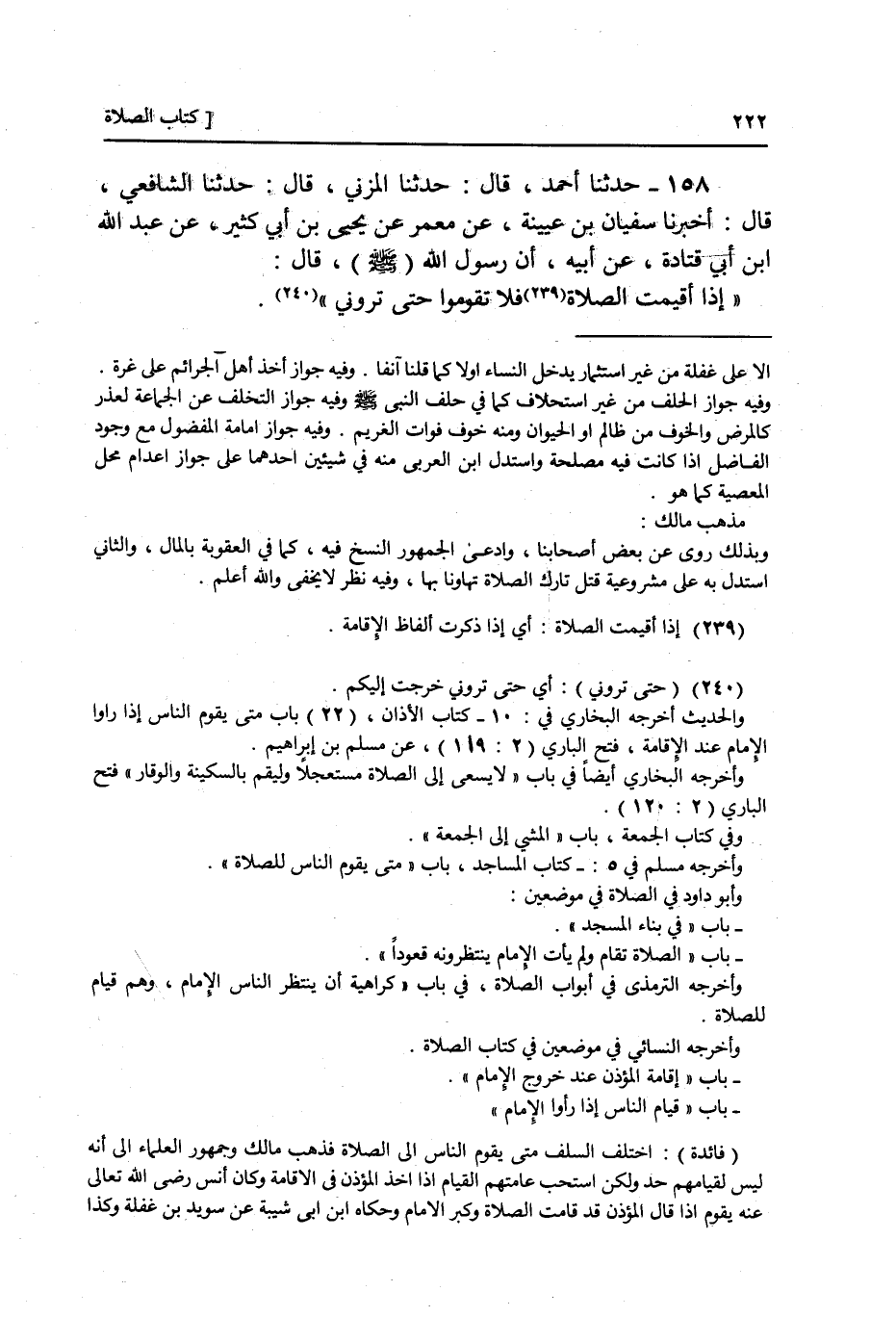 158 - أَنْبَأَنَا سُفْيَانُ بْنُ عُيَيْنَةَ , عَنْ مَعْمَرٍ، عَنْ يَحْيَى بْنِ أَبِي كَثِيرٍ، عَنْ عَبْدِ اللَّهِ بْنِ أَبِي قَتَادَةَ، عَنْ أَبِيهِ، أَنَّ رَسُولَ اللَّهِ صَلَّى اللهُ عَلَيْهِ وَسَلَّمَ قَالَ: «§إِذَا أُقِيمَتِ الصَّلَاةُ فَلَا تَقُومُوا حَتَّى تَرَوْنِي»