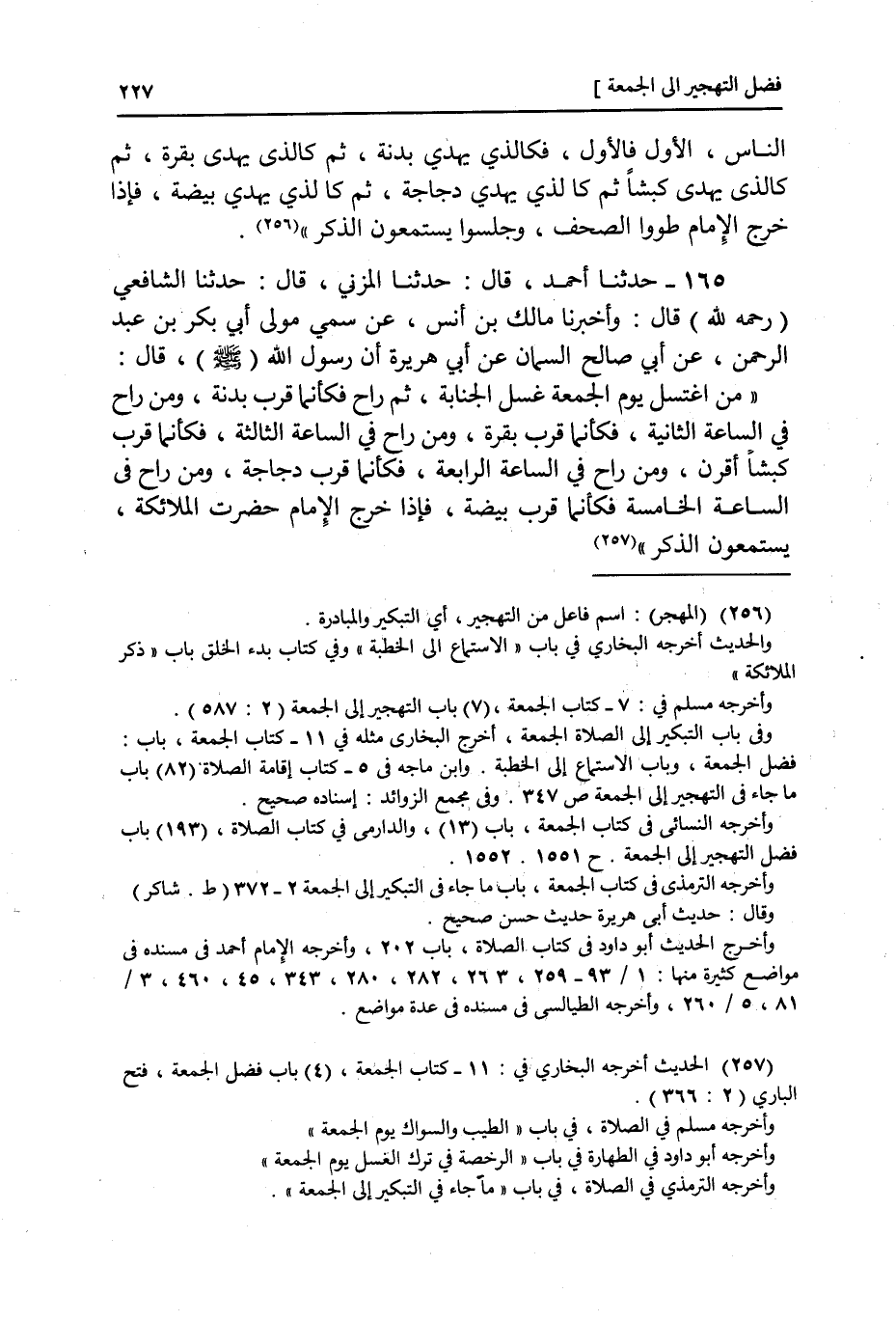 165 - أَنْبَأَنَا مَالِكُ بْنُ أَنَسٍ، عَنْ سُمَيٍّ، مَوْلَى أَبِي بَكْرِ بْنِ عَبْدِ الرَّحْمَنِ , عَنْ أَبِي صَالِحٍ السَّمَّانِ , عَنْ أَبِي هُرَيْرَةَ، أَنَّ رَسُولَ اللَّهِ صَلَّى اللهُ عَلَيْهِ وَسَلَّمَ قَالَ: «§مَنِ اغْتَسَلَ يَوْمَ الْجُمُعَةِ غُسْلَ الْجَنَابَةِ ثُمَّ رَاحَ فَكَأَنَّمَا قَرَّبَ بَدَنَةً وَمَنْ رَاحَ فِي السَّاعَةِ الثَّانِيَةِ فَكَأَنَّمَا قَرَّبَ بَقَرَةً وَمَنْ رَاحَ فِي السَّاعَةِ الثَّالِثَةِ فَكَأَنَّمَا قَرَّبَ كَبْشًا أَقْرَنَ وَمَنْ رَاحَ فِي السَّاعَةِ الرَّابِعَةِ فَكَأَنَّمَا قَرَّبَ دَجَاجَةً وَمَنْ رَاحَ فِي السَّاعَةِ الْخَامِسَةِ فَكَأَنَّمَا قَرَّبَ بَيْضَةً فَإِذَا خَرَجَ الْإِمَامُ حَضَرَتِ الْمَلَائِكَةُ يَسْتَمِعُونَ الذِّكْرَ»