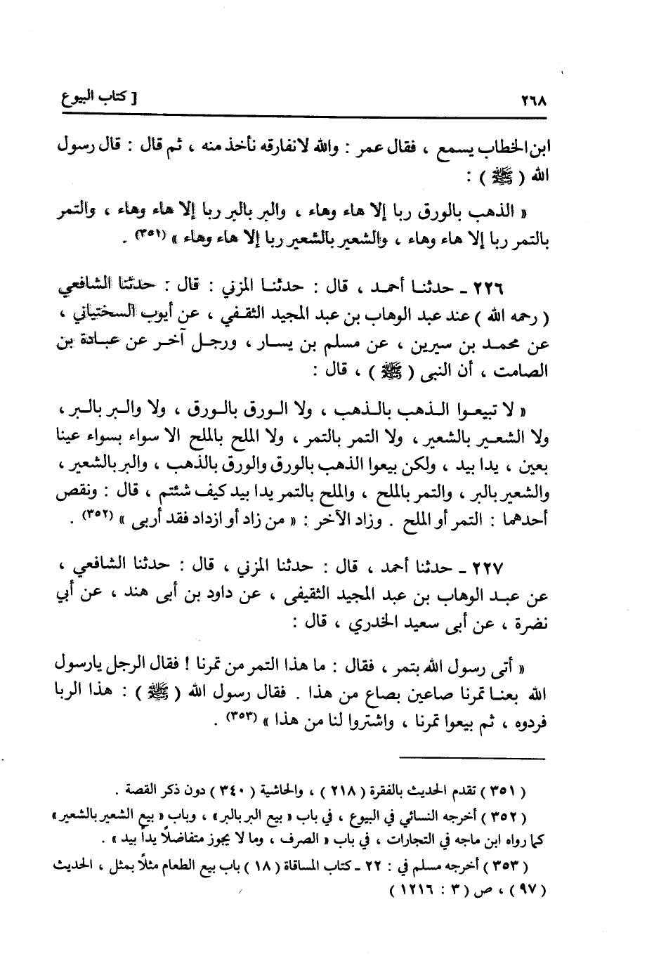 226 - حَدَّثَنَا عَبْدُ الْوَهَّابِ بْنُ عَبْدِ الْمَجِيدِ الثَّقَفِيُّ، عَنْ أَيُّوبَ السَّخْتِيَانِيِّ، عَنْ مُحَمَّدِ بْنِ سِيرِينَ، عَنْ مُسْلِمِ بْنِ يَسَارٍ، وَرَجُلٍ آخَرَ , عَنْ عُبَادَةَ بْنِ الصَّامِتِ، أَنَّ النَّبِيَّ صَلَّى اللهُ عَلَيْهِ وَسَلَّمَ قَالَ: «§لَا تَبِيعُوا الذَّهَبَ بِالذَّهَبِ وَلَا الْوَرِقَ بِالْوَرِقِ وَلَا الْبُرَّ بِالْبُرِّ وَلَا الشَّعِيرَ بِالشَّعِيرِ وَلَا التَّمْرَ بِالتَّمْرِ وَلَا الْمِلْحَ بِالْمِلْحِ إِلَّا سَوَاءً بِسَوَاءٍ عَيْنًا بِعَيْنٍ يَدًا بِيَدٍ وَلَكِنْ بِيعُوا الذَّهَبَ بِالْوَرِقِ وَالْوَرِقَ بِالذَّهَبِ وَالْبُرَّ بِالشَّعِيرِ وَالشَّعِيرَ بِالْبُرِّ وَالتَّمْرَ بِالْمِلْحِ وَالْمِلْحَ بِالتَّمْرِ يَدًا بِيَدٍ كَيْفَ شِئْتُمْ» . قَالَ وَنَقَصَ أَحَدُهُمَا التَّمْرَ أَوِ الْمِلْحَ وَزَادَ الْآخَرُ: «مَنْ زَادَ أَوِ ازْدَادَ فَقَدْ أَرْبَى»