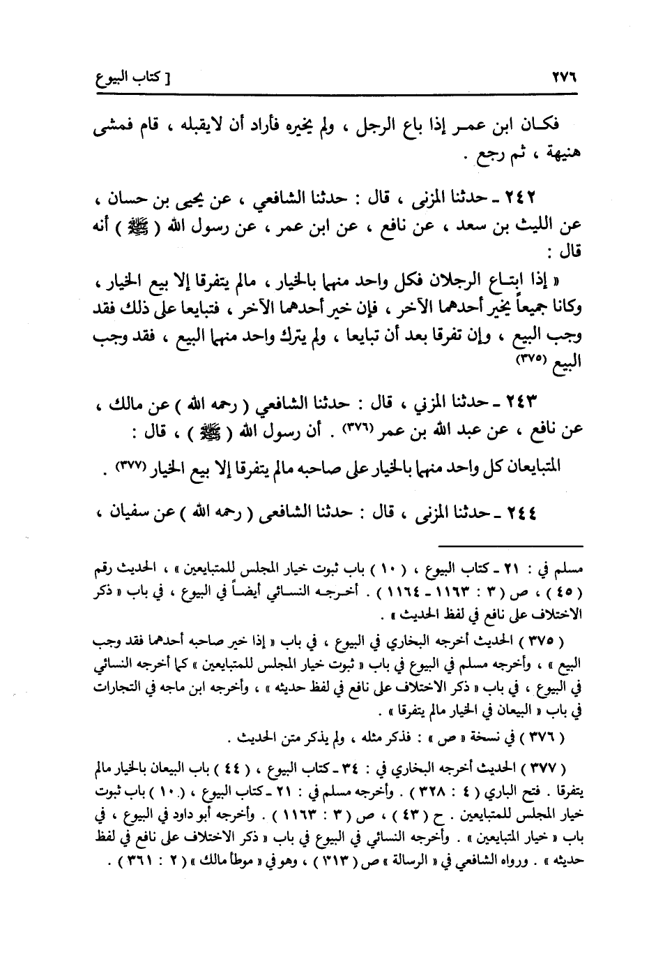 242 - عَنْ يَحْيَى بْنِ حَسَّانَ، عَنِ اللَّيْثِ بْنِ سَعْدٍ، عَنْ نَافِعٍ، عَنِ ابْنِ عُمَرَ، عَنْ رَسُولِ اللَّهِ صَلَّى اللهُ عَلَيْهِ وَسَلَّمَ أَنَّهُ قَالَ: «§إِذَا ابْتَاعَ الرَّجُلَانِ فَكُلُّ وَاحِدٍ مِنْهُمَا بِالْخِيَارِ مَا لَمْ يَتَفَرَّقَا إِلَّا بَيْعَ الْخِيَارِ وَكَانَا جَمِيعًا أَوْ يُخَيِّرُ أَحَدُهُمَا الْآخَرَ فَإِنْ خَيَّرَ أَحَدُهُمَا الْآخَرَ فَتَبَايَعَا عَلَى ذَلِكَ فَقَدْ وَجَبَ الْبَيْعُ وَإِنْ تَفَرَّقَا بَعْدَ أَنْ تَبَايَعَا وَلَمْ يَتْرُكْ وَاحِدٌ مِنْهُمَا الْبَيْعَ فَقَدْ وَجَبَ الْبَيْعُ»
