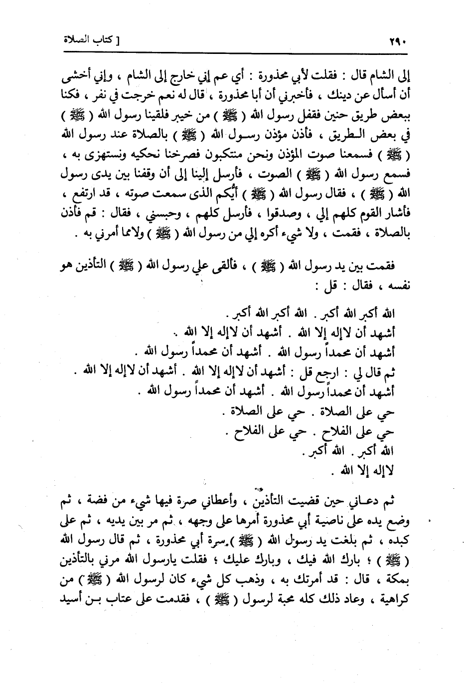 أَنْبَأَنَا مُسْلِمُ بْنُ خَالِدٍ، وَعَبْدُ اللَّهِ بْنُ الْحَارِثِ الْمَخْزُومِيُّ، قَالَا: حَدَّثَنَا ابْنُ جُرَيْجٍ، أَخْبَرَنِي عَبْدُ الْعَزِيزِ بْنُ عَبْدِ الْمَلِكِ بْنِ أَبِي مَحْذُورَةَ، أَنَّ عَبْدَ اللَّهِ بْنَ مُحَيْرِيزٍ، أَخْبَرَهُ وَكَانَ، يَتِيمًا فِي حِجْرِ أَبِي مَحْذُورَةَ حَتَّى جَهَّزَهُ إِلَى الشَّامِ قَالَ: فَقُلْتُ لِأَبِي مَحْذُورَةَ: أَيْ عَمِّ إِنِّي خَارِجٌ إِلَى الشَّامِ وَإِنِّي أَخْشَى أَنْ أُسْأَلَ عَنْ تَأْذِينِكِ، فَأَخْبَرَنِي أَنَّ أَبَا مَحْذُورَةَ قَالَ لَهُ نَعَمْ خَرَجْتُ فِي نَفَرٍ فَكُنَّا بِبَعْضِ طَرِيقِ حُنَيْنٍ فَقَفَلَ رَسُولُ اللَّهِ صَلَّى اللهُ عَلَيْهِ وَسَلَّمَ مِنْ حُنَيْنٍ فَلَقِينَا رَسُولَ اللَّهِ صَلَّى اللهُ عَلَيْهِ وَسَلَّمَ فِي بَعْضِ الطَّرِيقِ فَأَذَّنَ مُؤَذِّنُ رَسُولِ اللَّهِ صَلَّى اللهُ عَلَيْهِ وَسَلَّمَ بِالصَّلَاةِ عِنْدَ رَسُولِ اللَّهِ صَلَّى اللهُ عَلَيْهِ وَسَلَّمَ فَسَمِعْنَا صَوْتَ الْمُؤَذِّنِ وَنَحْنُ مُتَنَكِّبُونَ فَصَرَخْنَا نَحْكِيهِ وَنَسْتَهْزِئُ بِهِ فَسَمِعَ رَسُولُ اللَّهِ صَلَّى اللهُ عَلَيْهِ وَسَلَّمَ الصَّوْتَ فَأَرْسَلَ إِلَيْنَا إِلَى أَنْ وَقَفْنَا بَيْنَ يَدَيْ رَسُولِ اللَّهِ صَلَّى اللهُ عَلَيْهِ وَسَلَّمَ فَقَالَ رَسُولُ اللَّهِ صَلَّى اللهُ عَلَيْهِ وَسَلَّمَ: «أَيُّكُمُ الَّذِي سَمِعْتُ صَوْتَهُ قَدِ ارْتَفَعَ؟» فَأَشَارَ الْقَوْمُ كُلُّهُمْ إِلَيَّ وَصَدَقُوا فَأَرْسَلَ كُلَّهُمْ وَحَبَسَنِي فَقَالَ: «قُمْ فَأَذِّنْ بِالصَّلَاةِ» فَقُمْتُ وَلَا شَيْءَ أَكْرَهُ إِلَيَّ مِنْ رَسُولِ اللَّهِ صَلَّى اللهُ عَلَيْهِ وَسَلَّمَ وَلَا مِمَّا يَأْمُرُنِي بِهِ، فَقُمْتُ بَيْنَ يَدَيْ رَسُولِ اللَّهِ صَلَّى اللهُ عَلَيْهِ وَسَلَّمَ فَأَلْقَى عَلَيَّ رَسُولُ اللَّهِ صَلَّى اللهُ عَلَيْهِ وَسَلَّمَ التَّأْذِينَ هُوَ نَفْسَهُ فَقَالَ: " §قُلِ: اللَّهُ أَكْبَرُ اللَّهُ أَكْبَرُ اللَّهُ أَكْبَرُ اللَّهُ أَكْبَرُ، أَشْهَدُ أنْ لَا إِلَهَ إِلَّا اللَّهُ أَشْهَدُ أَنْ لَا إِلَهَ إِلَّا اللَّهُ. أَشْهَدُ أنَّ مُحَمَّدًا رَسُولُ اللَّهِ أَشْهَدُ أَنَّ مُحَمَّدًا رَسُولُ اللَّهِ، ثُمَّ قَالَ لِي: ارْجِعْ وَامْدُدْ مِنْ صَوْتِكَ ثُمَّ قَالَ لِي: قُلْ: أَشْهَدُ أنْ لَا إِلَهَ إِلَّا اللَّهُ أَشْهَدُ أَنْ لَا إِلَهَ إِلَّا اللَّهُ، أَشْهَدُ أنَّ مُحَمَّدًا رَسُولُ اللَّهِ أَشْهَدُ أَنَّ مُحَمَّدًا رَسُولُ اللَّهِ، حَيَّ عَلَى الصَّلَاةِ حَيَّ عَلَى الصَّلَاةِ حَيَّ عَلَى الْفَلَاحِ حَيَّ عَلَى الْفَلَاحِ اللَّهُ أَكْبَرُ اللَّهُ أَكْبَرُ لَا إِلَهَ إِلَّا اللَّهُ ثُمَّ دَعَانِي حِينَ قَضَيْتُ التَّأْذِينَ وَأَعْطَانِي صُرَّةً فِيهَا شَيْءٌ مِنْ فِضَّةٍ ثُمَّ وَضَعَ يَدَهُ عَلَى نَاصِيَةِ أَبِي مَحْذُورَةَ ثُمَّ أَمَرَّهَا عَلَى وَجْهِهِ ثُمَّ بَيْنَ ثَدْيَيْهِ ثُمَّ عَلَى كَبِدِهِ ثُمَّ بَلَغَتْ يَدُ رَسُولِ اللَّهِ صَلَّى اللهُ عَلَيْهِ وَسَلَّمَ سُرَّةَ أَبِي مَحْذُورَةَ ثُمَّ قَالَ رَسُولُ اللَّهِ صَلَّى اللهُ عَلَيْهِ وَسَلَّمَ: «بَارِكَ اللَّهُ فِيكَ وَبَارِكَ عَلَيْكَ» فَقُلْتُ: يَا رَسُولَ اللَّهِ مُرْنِي بِالتَّأْذِينِ بِمَكَّةَ. قَالَ: «قَدْ أَمَرْتُكَ بِهِ» وَذَهَبَ كُلُّ شَيْءٍ كَانَ لِرَسُولِ اللَّهِ صَلَّى اللهُ عَلَيْهِ وَسَلَّمَ مِنْ كَرَاهِيَةٍ وَعَادَ ذَلِكَ كُلُّهُ مَحَبَّةً لِرَسُولِ اللَّهِ صَلَّى اللهُ عَلَيْهِ وَسَلَّمَ فَقَدِمْتُ عَلَى عَتَّابِ بْنِ أَسِيدٍ -[291]- عَامَلِ رَسُولِ اللَّهِ صَلَّى اللهُ عَلَيْهِ وَسَلَّمَ بِمَكَّةَ فَأَذَّنْتُ مَعَهُ بِالصَّلَاةِ عَنْ أَمْرِ رَسُولِ اللَّهِ صَلَّى اللهُ عَلَيْهِ وَسَلَّمَ. قَالَ ابْنُ جُرَيْجٍ: وَأَخْبَرَن