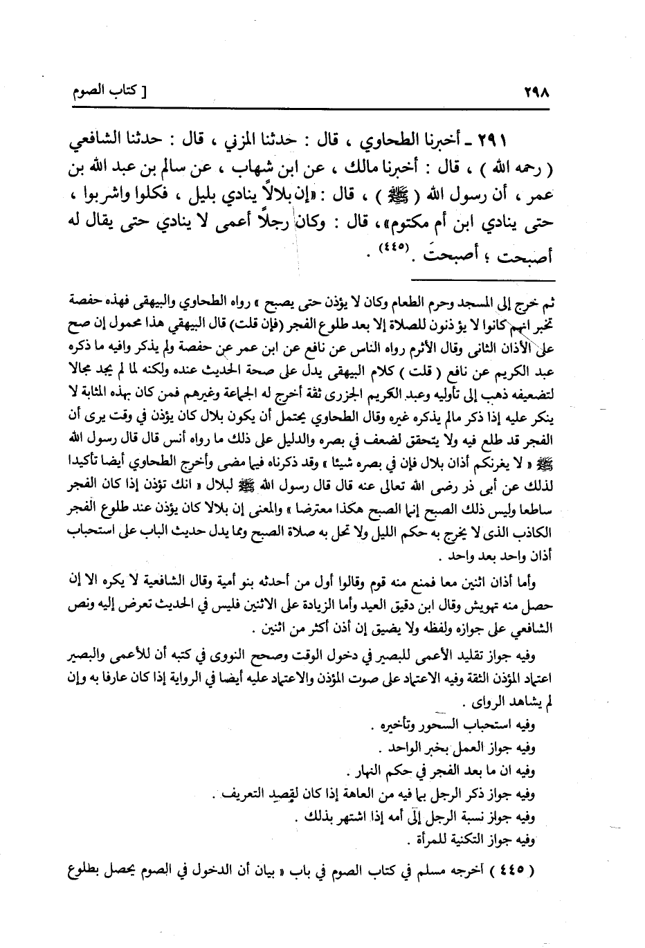 291 - أَنْبَأَنَا مَالِكٌ، عَنِ ابْنِ شِهَابٍ، عَنْ سَالِمِ بْنِ عَبْدِ اللَّهِ بْنِ عُمَرَ، أَنَّ رَسُولَ اللَّهِ صَلَّى اللهُ عَلَيْهِ وَسَلَّمَ قَالَ: «إِنَّ §بِلَالًا يُنَادِي بِلَيْلٍ فَكُلُوا وَاشْرَبُوا حَتَّى يُنَادِيَ ابْنُ أُمِّ مَكْتُومٍ» . قَالَ: وَكَانَ رَجُلًا أَعْمَى لَا يُنَادِي حَتَّى يُقَالَ لَهُ: أَصْبَحْتَ أَصْبَحْتَ