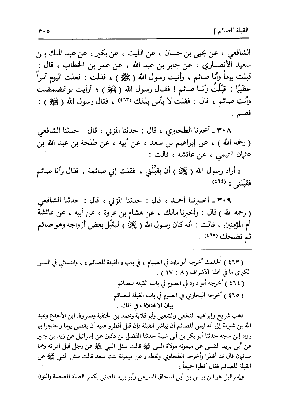 308 - عَنْ إِبْرَاهِيمَ بْنِ سَعْدٍ، عَنْ أَبِيهِ، عَنْ طَلْحَةَ بْنِ عَبْدِ اللَّهِ بْنِ عُثْمَانَ التَّيْمِيِّ، عَنْ عَائِشَةَ، قَالَتْ: أَرَادَ رَسُولُ اللَّهِ صَلَّى اللهُ عَلَيْهِ وَسَلَّمَ أَنْ يُقَبِّلَنِيَ فَقُلْتُ: إِنِّي صَائِمَةٌ فَقَالَ: «§وَأَنَا صَائِمٌ» فَقَبَّلَنِي