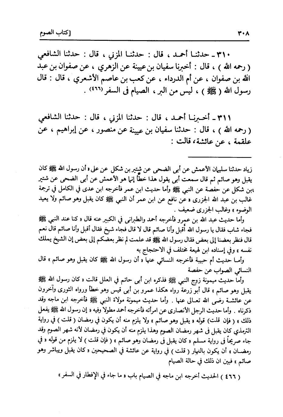 310 - حَدَّثَنَا سُفْيَانُ بْنُ عُيَيْنَةَ، عَنِ الزُّهْرِيِّ، عَنْ صَفْوَانَ بْنِ عَبْدِ اللَّهِ بْنِ صَفْوَانَ، عَنْ أُمِّ الدَّرْدَاءِ، عَنْ كَعْبِ بْنِ عَاصِمٍ الْأَشْعَرِيِّ، قَالَ: قَالَ رَسُولُ اللَّهِ صَلَّى اللهُ عَلَيْهِ وَسَلَّمَ: «§لَيْسَ مِنَ الْبِرِّ الصِّيَامُ فِي السَّفَرِ»