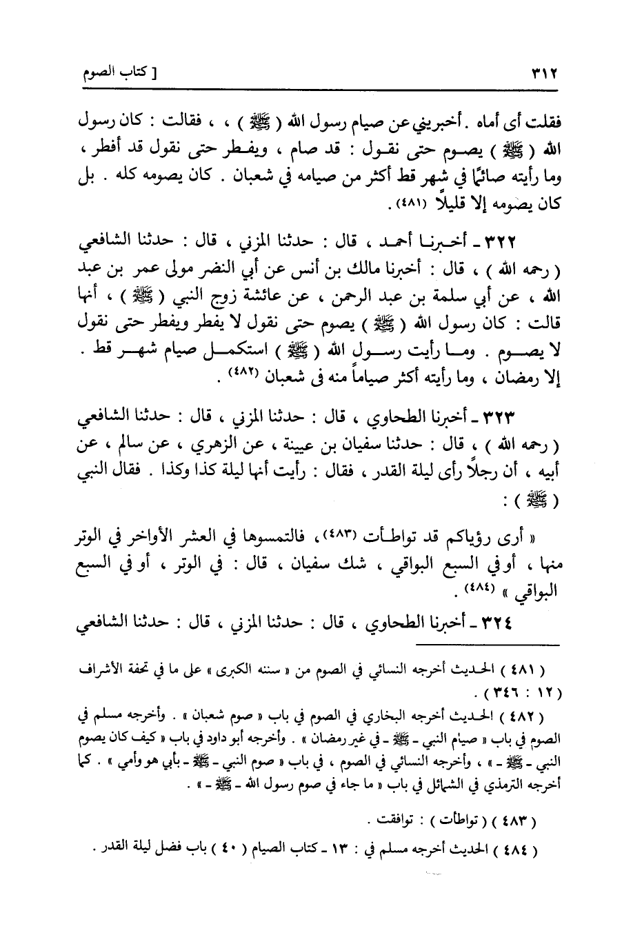 322 - أَنْبَأَنَا مَالِكُ بْنُ أَنَسٍ، عَنْ أَبِي النَّضْرِ، مَوْلَى عُمَرَ بْنِ عُبَيْدِ اللَّهِ , عَنْ أَبِي سَلَمَةَ بْنِ عَبْدِ الرَّحْمَنِ، عَنْ عَائِشَةَ، زَوْجِ النَّبِيِّ صَلَّى اللهُ عَلَيْهِ وَسَلَّمَ أَنَّهَا قَالَتْ: كَانَ رَسُولُ اللَّهِ صَلَّى اللهُ عَلَيْهِ وَسَلَّمَ §يَصُومُ حَتَّى نَقُولَ لَا يُفْطِرُ وَيُفْطِرُ حَتَّى نَقُولَ لَا يَصُومُ وَمَا رَأَيْتُ رَسُولَ اللَّهِ صَلَّى اللهُ عَلَيْهِ وَسَلَّمَ اسْتَكْمَلَ صِيَامَ شَهْرٍ قَطُّ إِلَّا رَمَضَانَ وَمَا رَأَيْتُهُ أَكْثَرَ صِيَامًا مِنْهُ فِي شَعْبَانَ