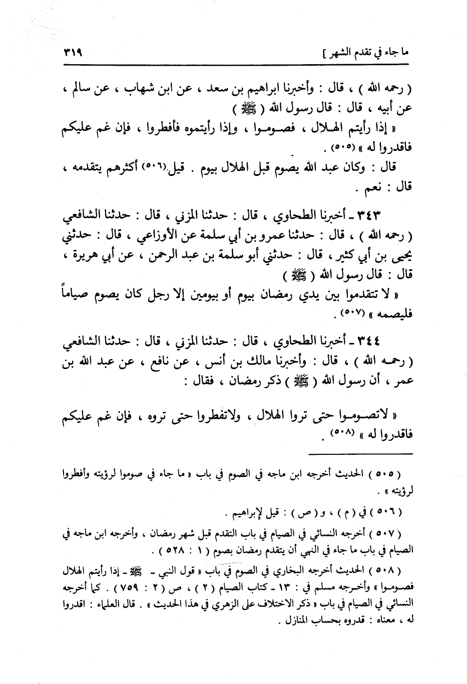 344 - وَأَخْبَرَنَا مَالِكُ بْنُ أَنَسٍ، عَنْ نَافِعٍ، عَنْ عَبْدِ اللَّهِ بْنِ عُمَرَ، أَنَّ رَسُولَ اللَّهِ صَلَّى اللهُ عَلَيْهِ وَسَلَّمَ ذَكَرَ رَمَضَانَ فَقَالَ: «§لَا تَصُومُوا حَتَّى تَرَوُا الْهِلَالَ وَلَا تُفْطِرُوا حَتَّى تَرَوْهُ فَإِنْ غُمَّ عَلَيْكُمْ فَاقْدُرُوا لَهُ»
