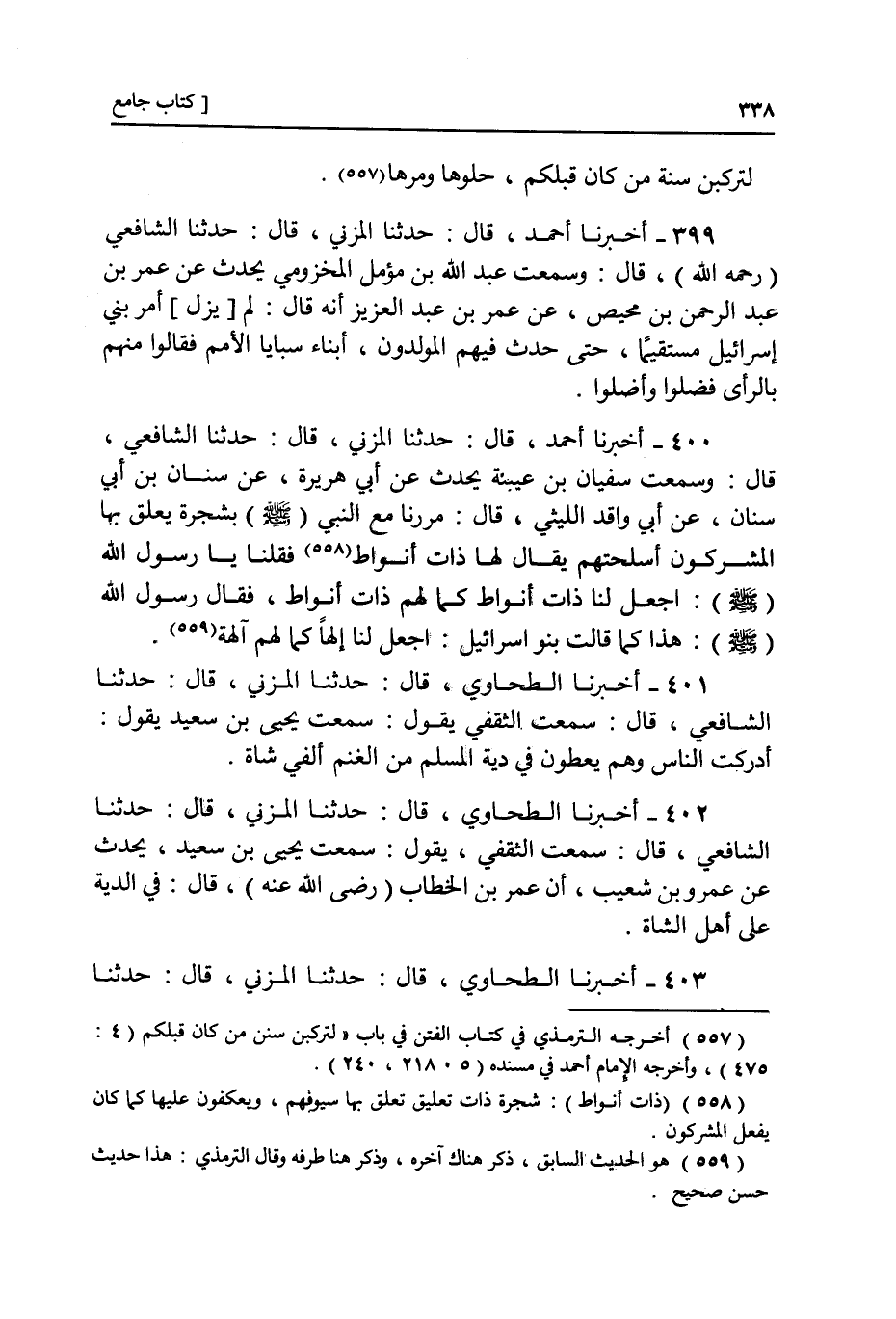 400 - وَسَمِعْتُ سُفْيَانَ بْنَ عُيَيْنَةَ، يُحَدِّثُ عَنِ الزُّهْرِيِّ، عَنْ سِنَانٍ، عَنْ أَبِي وَاقِدٍ اللَّيْثِيِّ، قَالَ: مَرَرْنَا مَعَ النَّبِيِّ صَلَّى اللهُ عَلَيْهِ وَسَلَّمَ بِشَجَرَةٍ يُعَلِّقُ بِهَا الْمُشْرِكُونَ أَسْلِحَتَهُمْ يُقَالُ لَهَا: ذَاتُ أَنْوَاطٍ فَقُلْنَا: يَا رَسُولَ اللَّهِ صَلَّى اللهُ عَلَيْهِ وَسَلَّمَ: اجْعَلْ لَنَا ذَاتَ أَنْوَاطٍ كَمَا لَهُمْ ذَاتُ أَنْوَاطٍ فَقَالَ رَسُولُ اللَّهِ صَلَّى اللهُ عَلَيْهِ وَسَلَّمَ: " §هَذَا كَمَا قَالَتْ بَنُو إِسْرَائِيلَ: {اجْعَلْ لَنَا إِلَهًا كَمَا لَهُمُ آلِهَةٌ} [الْأَعْرَاف: 138] "