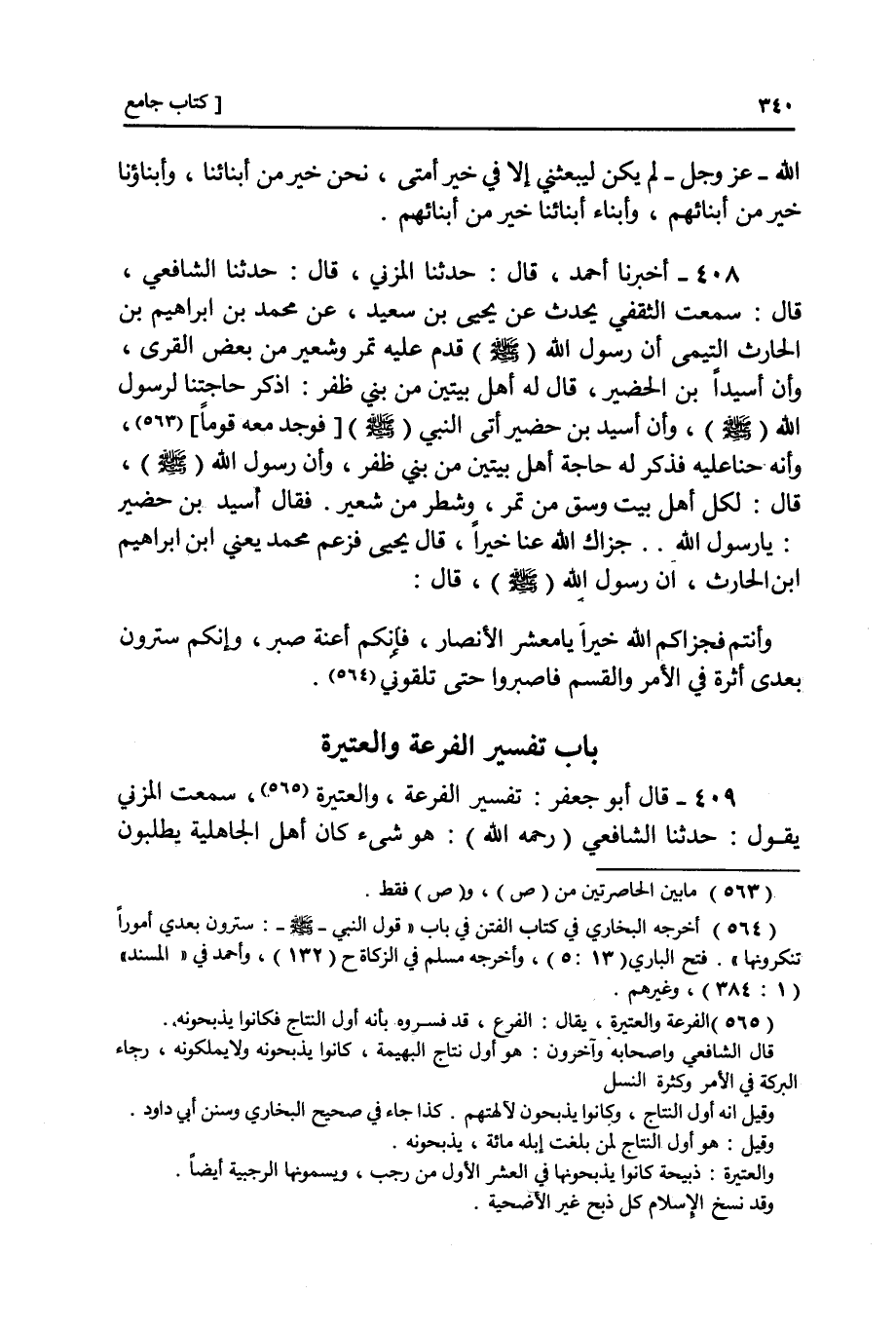 409 - قَالَ لَنَا أَبُو جَعْفَرٍ: تَفْسِيرُ الْفَرَعَةِ وَالْعَتِيرَةِ سَمِعْتُ الْمُزَنِيَّ يَقُولُ: قَالَ الشَّافِعِيُّ رَحِمَهُ اللَّهُ: هُوَ شَيْءٌ كَانَ أَهْلُ الْجَاهِلِيَّةِ يَطْلُبُونَ بِهِ -[341]- الْبَرَكَةَ فِي أَمْوَالِهِمْ فَكَانَ أَحَدُهُمْ يَذْبَحُ بَكْرَ نَاقَتِهِ أَوْ شَاتِهِ وَلَا يَغْذُوهُ رَجَاءَ الْبَرَكَةِ فِيمَا يَأْتِي بَعْدَهُ فَسَأَلُوا النَّبِيَّ صَلَّى اللهُ عَلَيْهِ وَسَلَّمَ فَقَالَ: «أَفْرِعُوا إِنْ شِئْتُمْ» أَيِ اذْبَحُوا إِنْ شِئْتُمْ وَكَانُوا يَسْأَلُونَ عَمَّا كَانُوا يَصْنَعُونَهُ فِي الْجَاهِلِيَّةِ خَوْفًا أَنْ يُكْرَهَ فِي الْإِسْلَامِ فَأَعْلَمَهُمْ أَنَّهُ لَا مَكْرُوهَ عَلَيْهِمْ فِيهِ وَأَمَرَهُمُ اخْتِيَارًا أَنْ يَغْذُوهُ ثُمَّ يَحْمِلُونَ عَلَيْهِ فِي سَبِيلِ اللَّهِ عَزَّ وَجَلَّ