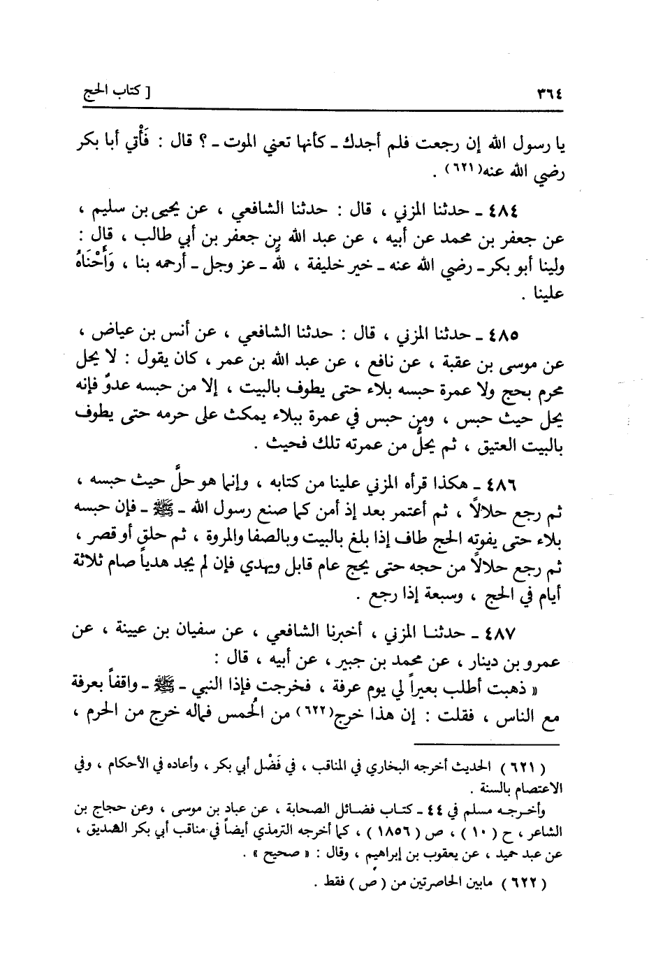 486 - عَنْ أَنَسِ بْنِ عِيَاضٍ، عَنْ مُوسَى بْنِ عُقْبَةَ، عَنْ نَافِعٍ، أَنَّ عَبْدَ اللَّهِ بْنَ عُمَرَ، كَانَ يَقُولُ: §لَا يَحِلُّ مُحْرِمٌ بِحَجٍّ وَلَا عُمْرَةٍ حَبَسَهُ بَلَاءٌ حَتَّى يَطُوفَ بِالْبَيْتِ إِلَّا مَنْ حَبَسَهُ عَدُوٌّ فَإِنَّهُ يَحِلُّ حَيْثُ حُبِسَ وَمَنْ حُبِسَ فِي عُمْرَةٍ بِبَلَاءٍ مَكَثَ عَلَى حَرَمِهِ حَتَّى يَطُوفَ بِالْبَيْتِ الْعَتِيقِ ثُمَّ يَحِلَّ مِنْ عُمْرَتِهِ فَإِنْ مَنَعَهُ عَدُوٌّ فِي عُمْرَتِهِ تِلْكَ حَلَّ حَيْثُ حَبَسَهُ " قَالَ أَبُو جَعْفَرٍ: هَكَذَا قَرَأَهُ الْمُزَنِيُّ عَلَيْنَا مِنْ كِتَابِهِ وَإِنَّمَا هُوَ حَلَّ حَيْثُ حَبَسَهُ ثُمَّ رَجَعَ حَلَالًا ثُمَّ اعْتَمَرَ بَعْدَ إِذَا أَمِنَ كَمَا صَنَعَ رَسُولُ اللَّهِ صَلَّى اللهُ عَلَيْهِ وَسَلَّمَ وَإِنْ حَبَسَهُ بَلَاءٌ حَتَّى يَفُوتَهُ الْحَجُّ طَافَ إِذَا بَلَغَ بِالْبَيْتِ وَبَيْنَ الصَّفَا وَالْمَرْوَةِ ثُمَّ حَلَقَ أَوْ قَصَّرَ ثُمَّ رَجَعَ حَلَالًا مِنْ حَجِّهِ حَتَّى يَحُجَّ عَامَ قَابِلٍ وَيُهْدِي فَإِنْ لَمْ يَجِدْ هَدْيًا صَامَ ثَلَاثَةَ أَيَّامٍ فِي الْحَجِّ وَسَبْعَةً إِذَا رَجَعَ