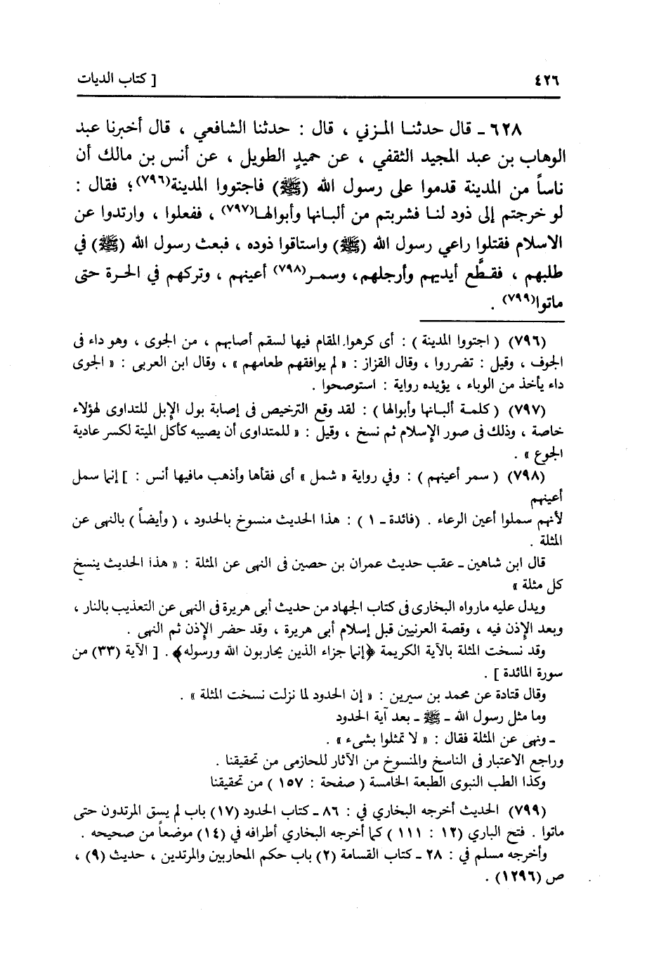 628 - أَنْبَأَنَا عَبْدُ الْوَهَّابِ بْنُ عَبْدِ الْمَجِيدِ الثَّقَفِيُّ، عَنْ حُمَيْدٍ الطَّوِيلِ، عَنْ أَنَسِ بْنِ مَالِكٍ، أَنَّ نَاسًا، مِنَ عُرَيْنَةَ قَدِمُوا عَلَى رَسُولِ اللَّهِ صَلَّى اللهُ عَلَيْهِ وَسَلَّمَ فَاجْتَوَوَا الْمَدِينَةَ فَقَالَ: لَوْ خَرَجْتُمْ إِلَى ذَوْدٍ لَنَا فَشَرِبْتُمْ مِنْ أَلْبَانِهَا وَأَبْوَالِهَا فَفَعَلُوا ذَلِكَ وَارْتَدُّوا عَنِ الْإِسْلَامِ وَقَتَلُوا رَاعِيَ رَسُولِ اللَّهِ صَلَّى اللهُ عَلَيْهِ وَسَلَّمَ وَاسْتَاقُوا ذَوْدَهُ فَبَعَثَ رَسُولُ اللَّهِ صَلَّى اللهُ عَلَيْهِ وَسَلَّمَ فِي طَلَبِهِمْ §فَقَطَعَ أَيْدِيَهُمْ وَأَرْجُلَهُمْ وَسَمَرَ أَعْيُنَهُمْ وَتَرَكَهُمْ فِي الْحَرَّةِ حَتَّى مَاتُوا ".