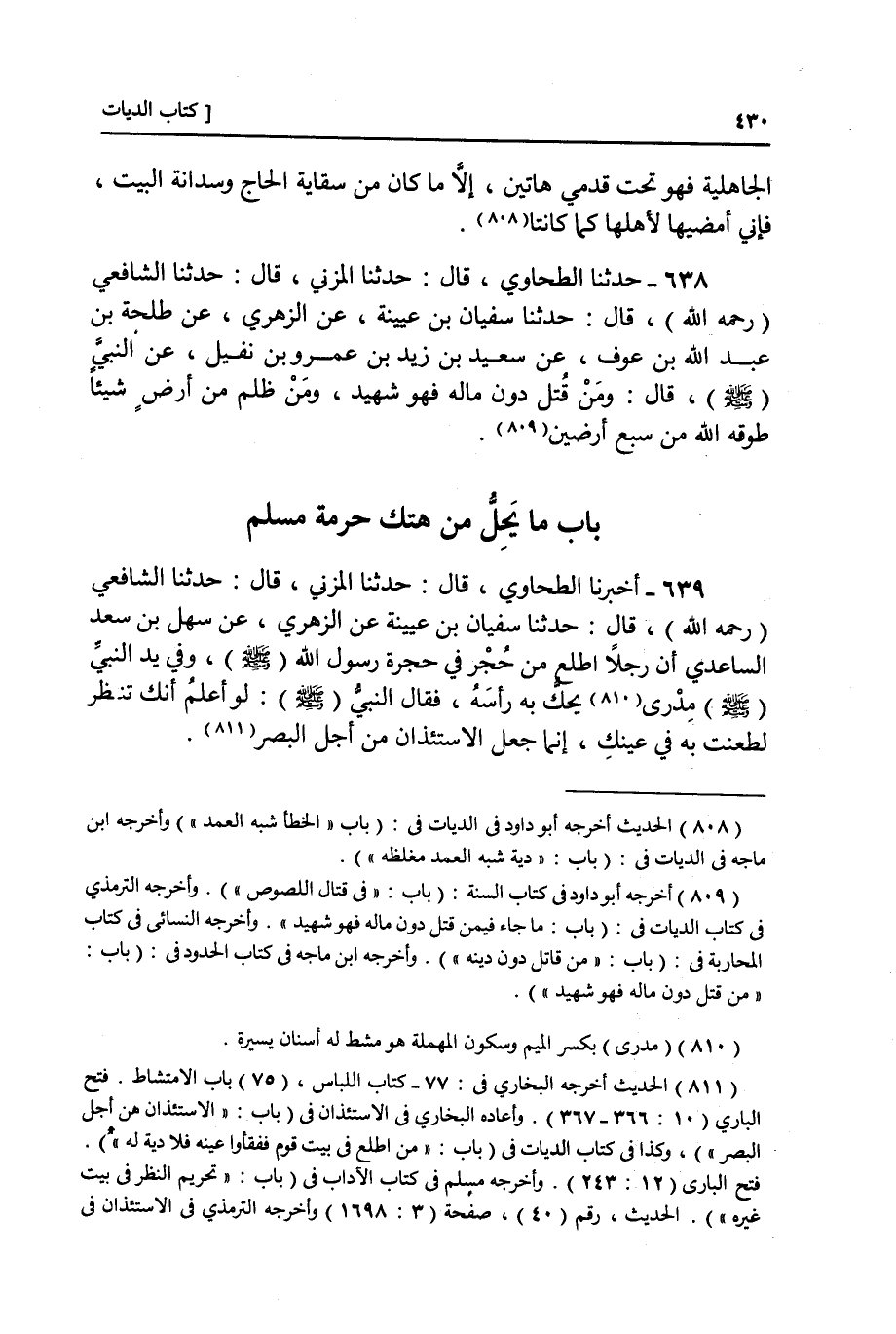 638 - أَنْبَأَنَا سُفْيَانُ بْنُ عُيَيْنَةَ، عَنِ الزُّهْرِيِّ، عَنْ طَلْحَةَ بْنِ عَبْدِ اللَّهِ بْنِ عَوْفٍ، عَنْ سَعِيدِ بْنِ زَيْدِ بْنِ عَمْرِو بْنِ نُفَيْلٍ، عَنِ النَّبِيِّ صَلَّى اللهُ عَلَيْهِ وَسَلَّمَ قَالَ: «§وَمَنْ قُتِلَ دُونَ مَالِهِ فَهُوَ شَهِيدٌ وَمَنْ ظَلَمَ مِنْ أَرْضٍ شِبْرًا طُوِّقَهُ مِنْ سَبْعِ أَرَضِينَ»