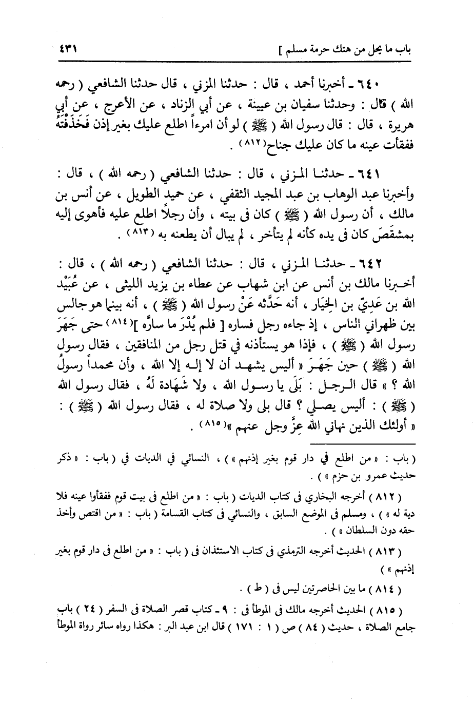 640 - أَنْبَأَنَا سُفْيَانُ، عَنْ أَبِي الزِّنَادِ، عَنِ الْأَعْرَجِ، عَنْ أَبِي هُرَيْرَةَ، قَالَ: قَالَ رَسُولُ اللَّهِ صَلَّى اللهُ عَلَيْهِ وَسَلَّمَ: «§لَوْ أَنَّ امْرَأً اطَّلَعَ عَلَيْكَ بِغَيْرِ إِذْنٍ فَخَذَفْتَهُ فَفَقَأْتَ عَيْنَهُ مَا كَانَ عَلَيْكَ جُنَاحٌ»