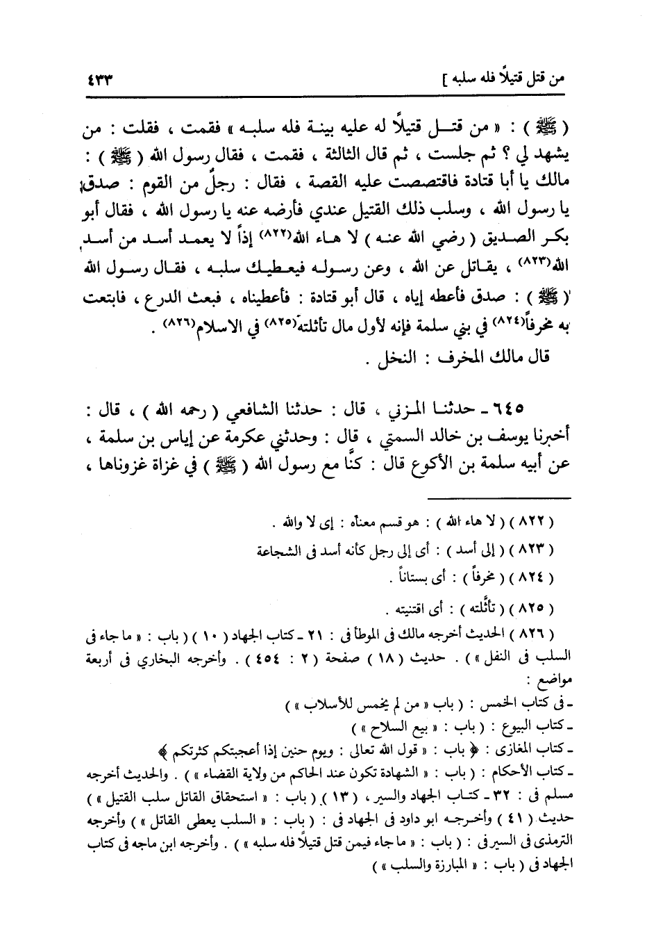 645 - أَنْبَأَنَا يُونُسُ بْنُ خَالِدٍ السَّمْتِيُّ، حَدَّثَنِي عِكْرِمَةُ، عَنْ إِيَاسِ بْنِ سَلَمَةَ، عَنْ أَبِيهِ، سَلَمَةَ بْنِ الْأَكْوَعِ قَالَ: كُنَّا مَعَ النَّبِيِّ صَلَّى اللهُ عَلَيْهِ وَسَلَّمَ فِي غَزَاةٍ غَزَوْنَاهَا فَجَاءَ رَجُلٌ طَلِيعَةٌ فَقَتَلَهُ سَلَمَةُ بْنُ الْأَكْوَعِ فَقَالَ النَّبِيُّ صَلَّى اللهُ عَلَيْهِ وَسَلَّمَ: «مَنْ قَتَلَ الرَّجُلَ؟» قَالُوا: سَلَمَةُ بْنُ الْأَكْوَعِ، فَقَالَ النَّبِيُّ صَلَّى اللهُ عَلَيْهِ وَسَلَّمَ: «§لَهُ سَلَبُهُ أَجْمَعُ»
