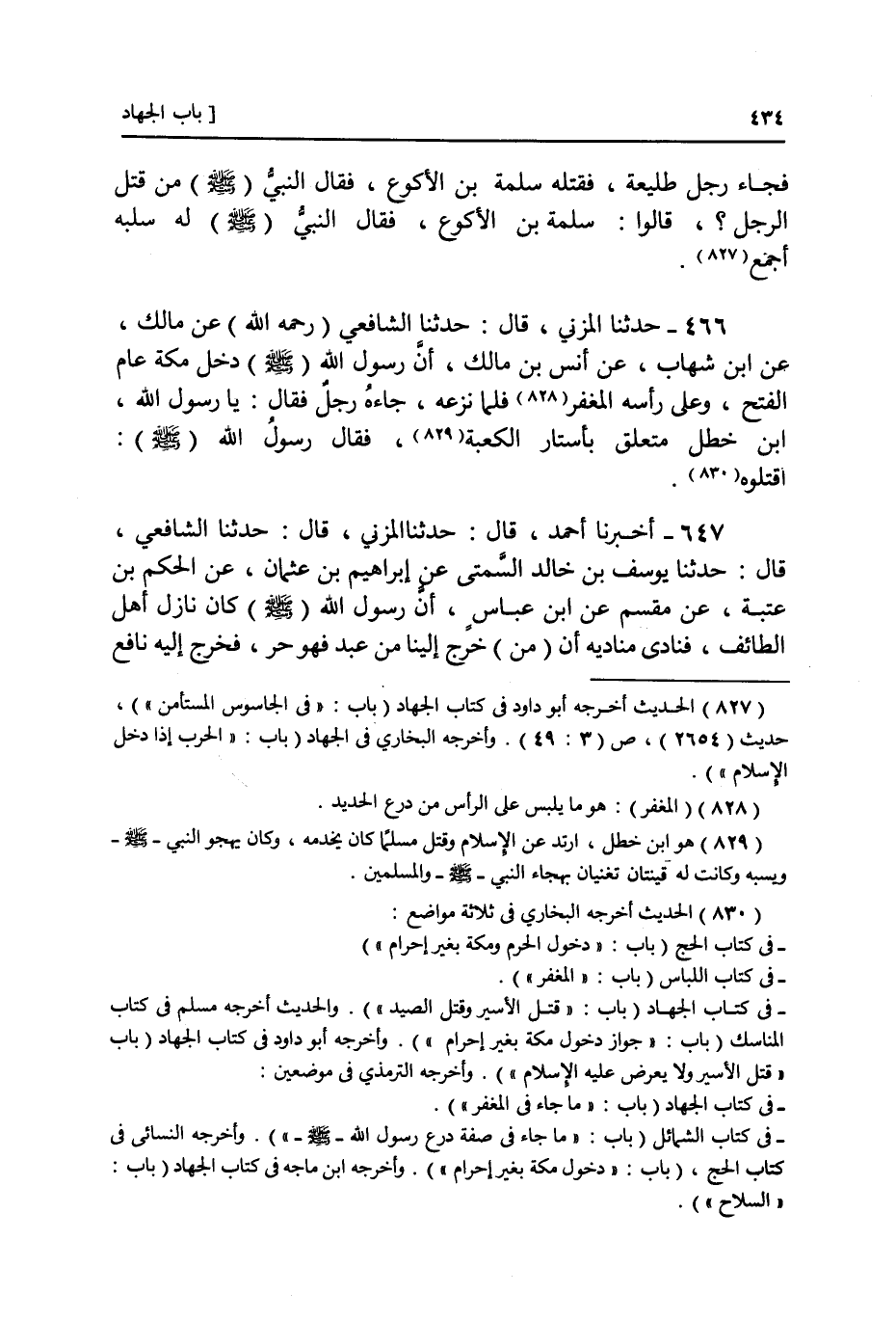 عَنْ مَالِكٍ، عَنِ ابْنِ شِهَابٍ، عَنْ أَنَسِ بْنِ مَالِكٍ، أَنَّ رَسُولَ اللَّهِ صَلَّى اللهُ عَلَيْهِ وَسَلَّمَ دَخَلَ مَكَّةَ عَامَ الْفَتْحِ وَعَلَى رَأْسِهِ الْمِغْفَرُ فَلَمَّا نَزَعَهُ جَاءَهُ رَجُلٌ فَقَالَ: يَا رَسُولَ اللَّهِ، §ابْنُ خَطَلٍ مُتَعَلِّقٌ بِأَسْتَارِ الْكَعْبَةِ فَقَالَ النَّبِيُّ صَلَّى اللهُ عَلَيْهِ وَسَلَّمَ: «اقْتُلُوهُ»