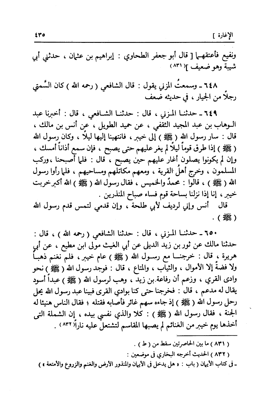 649 - أَنْبَأَنَا عَبْدُ الْوَهَّابِ بْنُ عَبْدِ الْمَجِيدِ الثَّقَفِيُّ، عَنْ حُمَيْدٍ الطَّوِيلِ، عَنْ أَنَسِ بْنِ مَالِكٍ، قَالَ: سَارَ رَسُولُ اللَّهِ صَلَّى اللهُ عَلَيْهِ وَسَلَّمَ إِلَى خَيْبَرَ فَانْتَهَيْنَا إِلِيَهَا لَيْلًا وَكَانَ رَسُولُ اللَّهِ صَلَّى اللهُ عَلَيْهِ وَسَلَّمَ إِذَا طَرَقَ قَوْمًا لَيْلًا لَمْ يُغِرْ عَلَيْهِمْ حَتَّى يُصْبِحَ فَإِنْ سَمِعَ أَذَانًا أَمْسَكَ، وَإِنْ لَمْ يَكُونُوا يُصَلُّونَ أَغَارَ عَلَيْهِمْ حِينَ يُصْبِحُ قَالَ: فَلَمَّا أَصْبَحْنَا رَكِبَ وَرَكِبَ الْمُسْلِمُونَ وَخَرَجَ أَهْلُ الْقَرْيَةِ وَمَعَهُمْ مَكَاتِلُهُمْ وَمَسَاحِيهِمْ فَلَمَّا رَأَوْا رَسُولَ اللَّهِ صَلَّى اللهُ عَلَيْهِ وَسَلَّمَ قَالُوا: مُحَمَّدٌ وَالْخَمِيسُ فَقَالَ رَسُولُ اللَّهِ صَلَّى اللهُ عَلَيْهِ وَسَلَّمَ: " اللَّهُ أَكْبَرُ §خَرِبَتْ خَيْبَرُ إِنَّا إِذَا نَزَلْنَا بِسَاحَةِ قَوْمٍ {فَسَاءَ صَبَاحُ الْمُنْذَرِينَ} [الصافات: 177] " قَالَ أَنَسٌ: وَإِنِّي لَرَدِيفٌ لِأَبِي طَلْحَةَ وَإِنَّ قَدَمَيَّ لَتَمَسُّ قَدَمَ رَسُولِ اللَّهِ صَلَّى اللهُ عَلَيْهِ وَسَلَّمَ