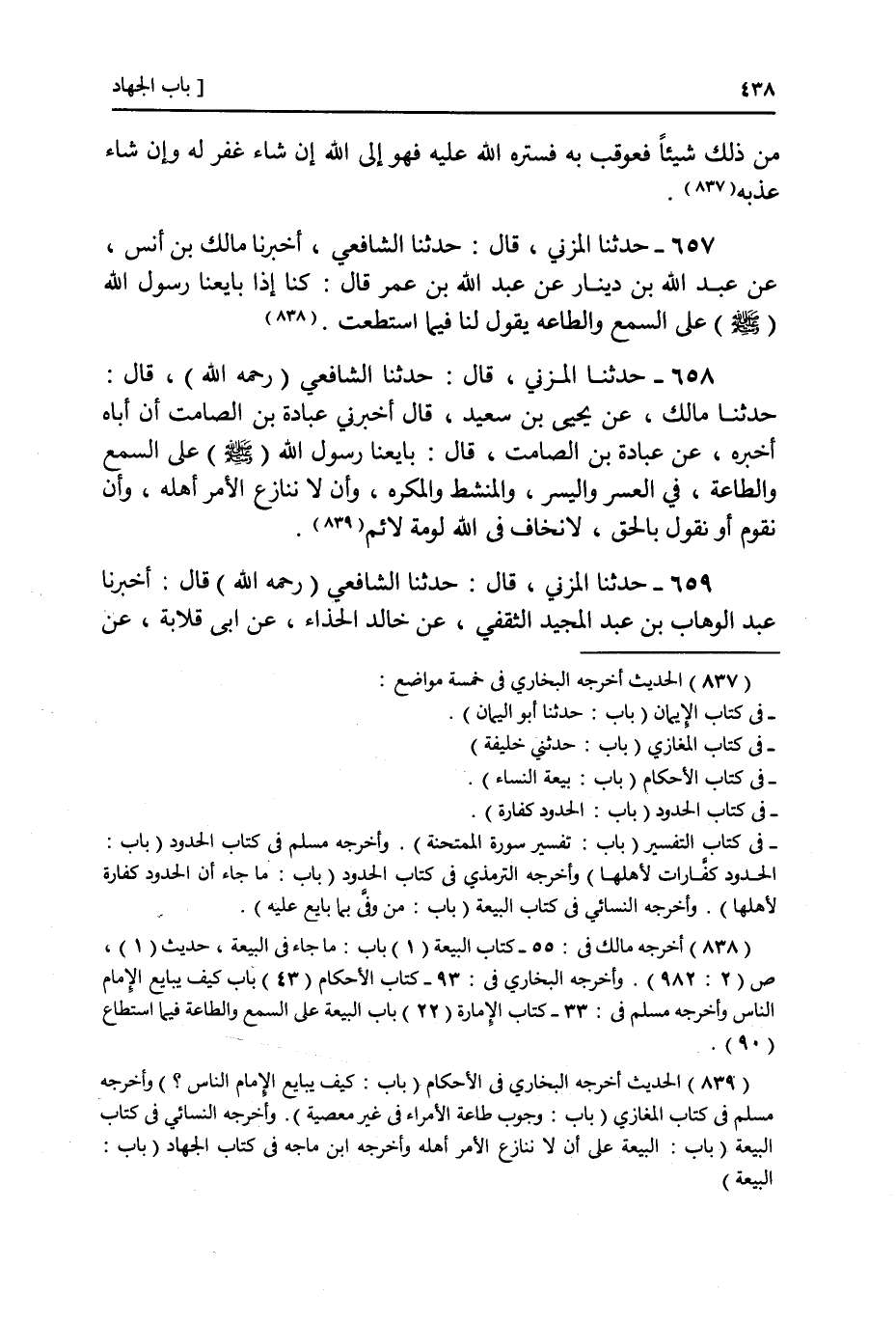 659 - أَنْبَأَنَا عَبْدُ الْوَهَّابِ بْنُ عَبْدِ الْمَجِيدِ الثَّقَفِيُّ، عَنْ خَالِدٍ الْحَذَّاءِ، عَنْ أَبِي قِلَابَةَ، عَنْ أَبِي الْأَشْعَثِ، عَنْ عُبَادَةَ بْنِ الصَّامِتِ، قَالَ: أَخَذَ عَلَيْنَا رَسُولُ اللَّهِ صَلَّى اللهُ عَلَيْهِ وَسَلَّمَ سِتًّا كَمَا أَخَذَ عَلَى النِّسَاءِ: «§أنْ لَا تُشْرِكُوا بِاللَّهِ شَيْئًا وَلَا تَسْرِقُوا وَلَا تَزْنُوا وَلَا تَقْتُلُوا أَوْلَادَكُمْ وَلَا يَعْضَهَ بَعْضُكُمْ بَعْضًا وَأَنْ لَا تَعْصُونِي فِي مَعْرُوفٍ أَمَرْتُكُمْ بِهِ فَمَنْ أَصَابَ مِنْكُمْ مِنْهُنَّ وَاحِدَةً فعُجِّلَتْ عُقُوبَتُهُ فَهُوَ كَفَّارَتُهُ وَمَنْ أُخِّرَتْ عُقُوبَتُهُ فَأَمْرُهُ إِلَى اللَّهِ عَزَّ وَجَلَّ إِنْ شَاءَ عَذَّبَهُ وَإِنْ شَاءَ غَفَرَ لَهُ» .