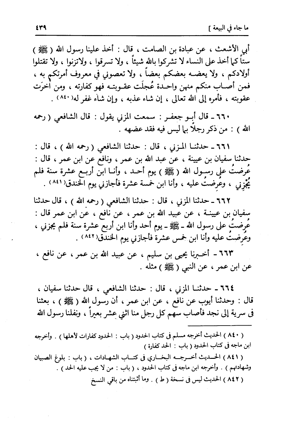 662 - أَنْبَأَنَا سُفْيَانُ بْنُ عُيَيْنَةَ، عَنْ عُبَيْدِ اللَّهِ بْنِ عُمَرَ، عَنْ نَافِعٍ، عَنِ ابْنِ عُمَرَ، قَالَ: عُرِضْتُ عَلَى رَسُولِ اللَّهِ صَلَّى اللهُ عَلَيْهِ وَسَلَّمَ يَوْمَ أُحُدٍ وَأَنَا ابْنُ أَرْبَعَ عَشْرَةَ سَنَةً فَلَمْ يُجِزْنِي §وَعُرِضْتُ عَلَيْهِ وَأَنَا ابْنُ خَمْسَ عَشْرَةَ سَنَةً فَأَجَازَنِي يَوْمَ الْخَنْدَقِ ".