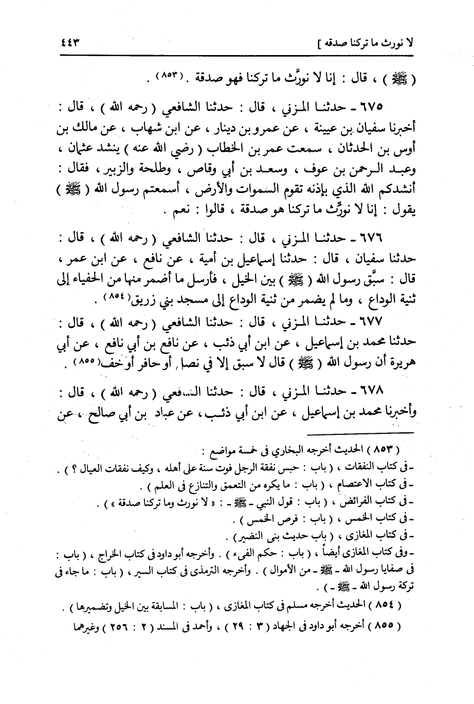 675 - أَنْبَأَنَا سُفْيَانُ، عَنْ عَمْرِو بْنِ دِينَارٍ، عَنِ ابْنِ شِهَابٍ، عَنْ مَالِكِ بْنِ أَوْسِ بْنِ الْحَدَثَانِ، قَالَ: سَمِعْتُ عُمَرَ بْنَ الْخَطَّابِ رَضِيَ اللَّهُ عَنْهُ يَنْشُدُ عُثْمَانَ بْنَ عَفَّانَ وَعَبْدَ الرَّحْمَنِ بْنَ عَوْفٍ وَسَعْدَ بْنَ أَبِي وَقَّاصٍ وَطَلْحَةَ وَالزُّبَيْرَ رَضِيَ اللَّهُ عَنْهُمْ فَقَالَ: أَنْشُدُكُمُ اللَّهَ الَّذِي بِإِذْنِهِ تَقُومُ السَّمَاءُ وَالْأَرْضُ، أَسَمِعْتُمْ رَسُولَ اللَّهِ صَلَّى اللهُ عَلَيْهِ وَسَلَّمَ يَقُولُ: «§إِنَّا لَا نُورَثُ، مَا تَرَكْنَا فَهُوَ صَدَقَةٌ» ؟ قَالُوا: نَعَمْ "