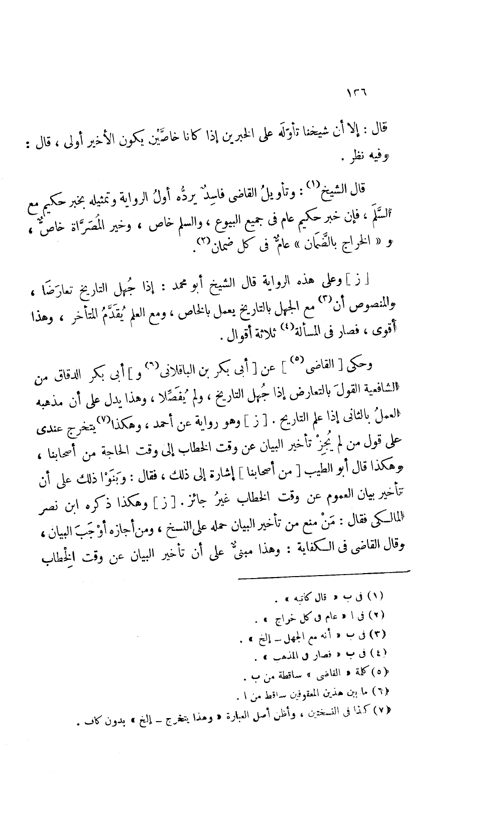 "ز" وعلى هذه الرواية قال الشيخ أبو محمد إذا جهل التاريخ تعارضا والمنصوص أن3 مع الجهل بالتاريخ يعمل بالخاص ومع العلم يقدم المتأخر وهذا أقوى فصار في المسألة4 ثلاثة أقوال.
