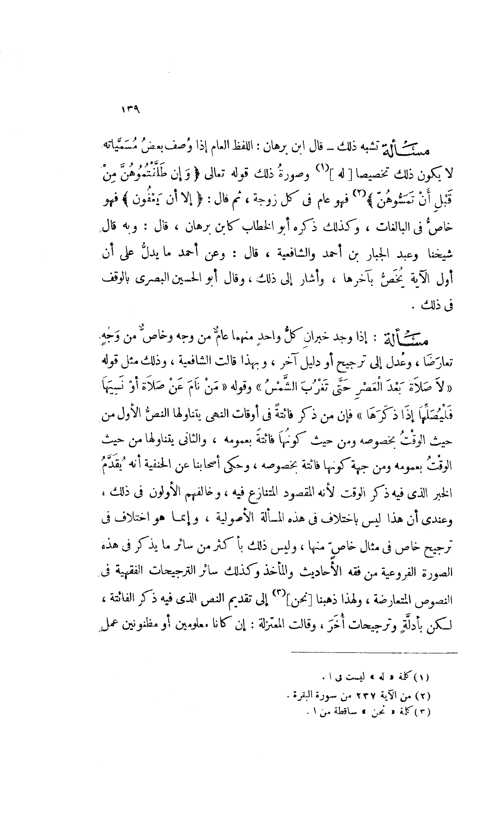مسألة: تشبه ذلك قال ابن برهان اللفظ العام إذا وصف بعض مسمياته لا يكون ذلك تخصيصا [له] 1 وصورة ذلك قوله تعالى: {وَإِنْ طَلَّقْتُمُوهُنَّ مِنْ قَبْلِ أَنْ تَمَسُّوهُنَّ} 2 فهو عام في كل زوجة ثم قال: {إِلَّا أَنْ يَعْفُونَ} فهو خاص في البالغات وكذلك ذكره أبو الخطاب كابن برهان قال وبه قال شيخنا وعبد الجبار بن أحمد والشافعية قال وعن أحمد ما يدل على أن أول الآية يخص بآخرها وأشار إلى ذلك وقال أبو الحسين البصري بالوقف في ذلك.