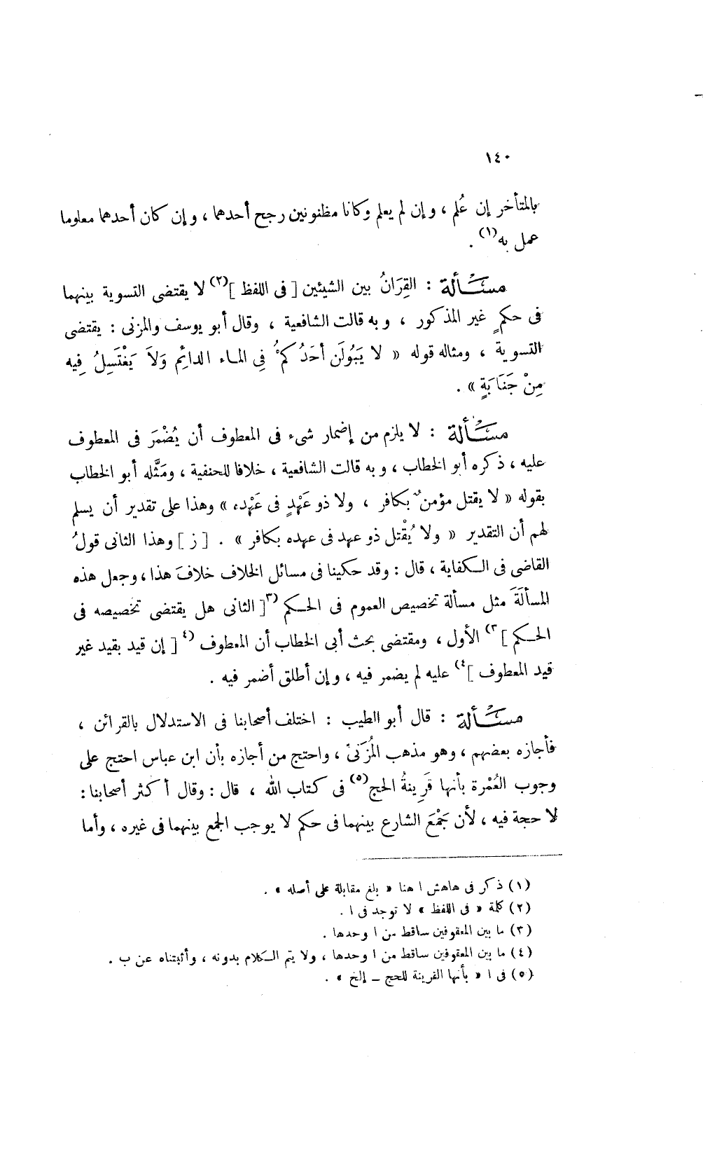 مسألة: قال أبو الطيب اختلف أصحابنا في الاستدلال بالقرائن فأجازه بعضهم وهو مذهب المزني واحتج من أجازه بأن ابن عباس احتج على وجوب العمرة بأنها قرينة الحج1 في كتاب الله قال وقال أكثر أصحابنا لا حجة فيه لأن جمع الشارع بينهما في حكم لا يوجب الجمع بينهما في غيره وأما