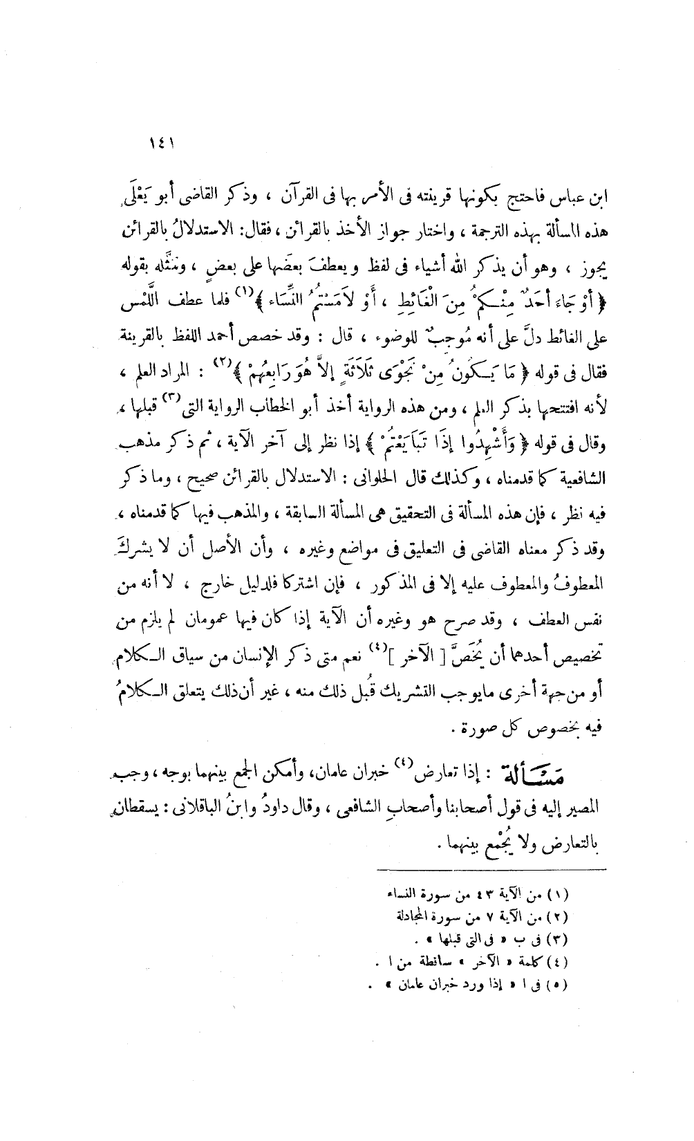 ابن عباس فاحتج بكونها قرينته في الأمر بها في القرآن وذكر القاضي أبو يعلى هذه المسألة بهذه الترجمة واختار جواز الأخذ بالقرائن فقال الاستدلال بالقرائن يجوز وهو أن يذكر الله أشياء في لفظ ويعطف بعضها على بعض ومثله بقوله: {أَوْ جَاءَ أَحَدٌ مِنْكُمْ مِنَ الْغَائِطِ أَوْ لامَسْتُمُ النِّسَاءَ} 1 فلما عطف اللمس على الغائط دل على أنه موجب للوضوء قال وقد خصص أحمد اللفظ بالقرينة فقال في قوله: {مَا يَكُونُ مِنْ نَجْوَى ثَلاثَةٍ إِلَّا هُوَ رَابِعُهُمْ} 2 المراد العلم لأنه افتتحها بذكر العلم ومن هذه الرواية أخذ أبو الخطاب الرواية التي3 قبلها وقال في قوله: {وَأَشْهِدُوا إِذَا تَبَايَعْتُمْ} إذا نظر إلى آخر الآية ثم ذكر مذهب الشافعية كما قدمناه وكذلك قال الحلواني الاستدلال بالقرائن صحيح وما ذكر فيه نظر فإن هذه المسألة في التحقيق هي المسألة السابقة والمذهب فيها كما قدمناه وقد ذكر معناه القاضي في التعليق في مواضع وغيره وأن الأصل أن لا يشرك المعطوف والمعطوف عليه إلا في المذكور فإن اشتركا فلدليل خارج لا أنه من نفس العطف وقد صرح هو وغيره أن الآية إذا كان فيها عمومان لم يلزم من تخصيص أحدهما أن يخص [الآخر] 4 نعم متى ذكر الإنسان من سياق الكلام أو من جهة أخرى ما يوجب التشريك قبل ذلك منه غير أن ذلك يتعلق الكلام فيه بخصوص كل صورة.