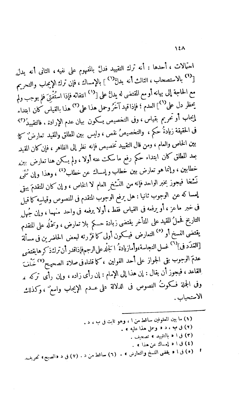 احتمالات أحدها أنه ترك التقييد فدل بالمفهوم على نفيه الثاني أنه يدل [بالاستصحاب الثالث أنه يدل] 1 بالإمساك فإن ترك الإيجاب والتحريم مع الحاجة إلى بيانه أو مع المقتضى له يدل على [انتفائه فإذا استفتى فلم يوجب ولم يحظر دل على] العدم فإذا قيد آخر وحمل هذا على2 هذا بالقياس كان ابتداء إيجاب أو تحريم بقياس وفي التخصيص يكون بيان عدم الإرادة فالتقييد3 في الحقيقة زيادة حكم والتخصيص نقص وليس بين المطلق والمقيد تعارض كما بين الخاص والعام ومن قال التقييد تخصيص فإنه نظر إلى الظاهر فإن كان المقيد بعد المطلق كان ابتداء حكم رفع ما سكت عنه أولا ولم يكن هناك تعارض بين خطابين وإنما هو تعارض بين خطاب وإمساك عن خطاب4 وهذا وإن سمى نسخا فيجوز بخبر الواحد فإنه من النسخ العام لا الخاص وإن كان المتقدم يبقى إمساكه عن الوجوب ثانيا هل يرفع الوجوب المتقدم في المنصوص وقياسه كما قيل في خبر ما عز أو يرفعه في القياس فقط أولا يرفعه في واحد منهما وإن جهل التاريخ فحمل المقيد على المتأخر يقتضى زيادة حكم بلا تعارض وحمله على المتقدم يقتضى النسخ أو5 التعارض فيكون أولى كما قررته لبعض الحاضرين في مسألة [العدد في] 6 غسل النجاسة وأما زيادة الجلد على الرجم فإذا قدر أن ترك ذكرها يقتضى عدم الوجوب بقى الجواز على أحد القولين كما قلناه في صلاة الصحيح7 خلف القاعد فيجوز أن يقال إن هذا إلى الإمام إن رأى زاده وإن رأى تركه وفي الجملة فسكوت النصوص في الدلالة على عدم الإيجاب واسع وكذلك الاستحباب.