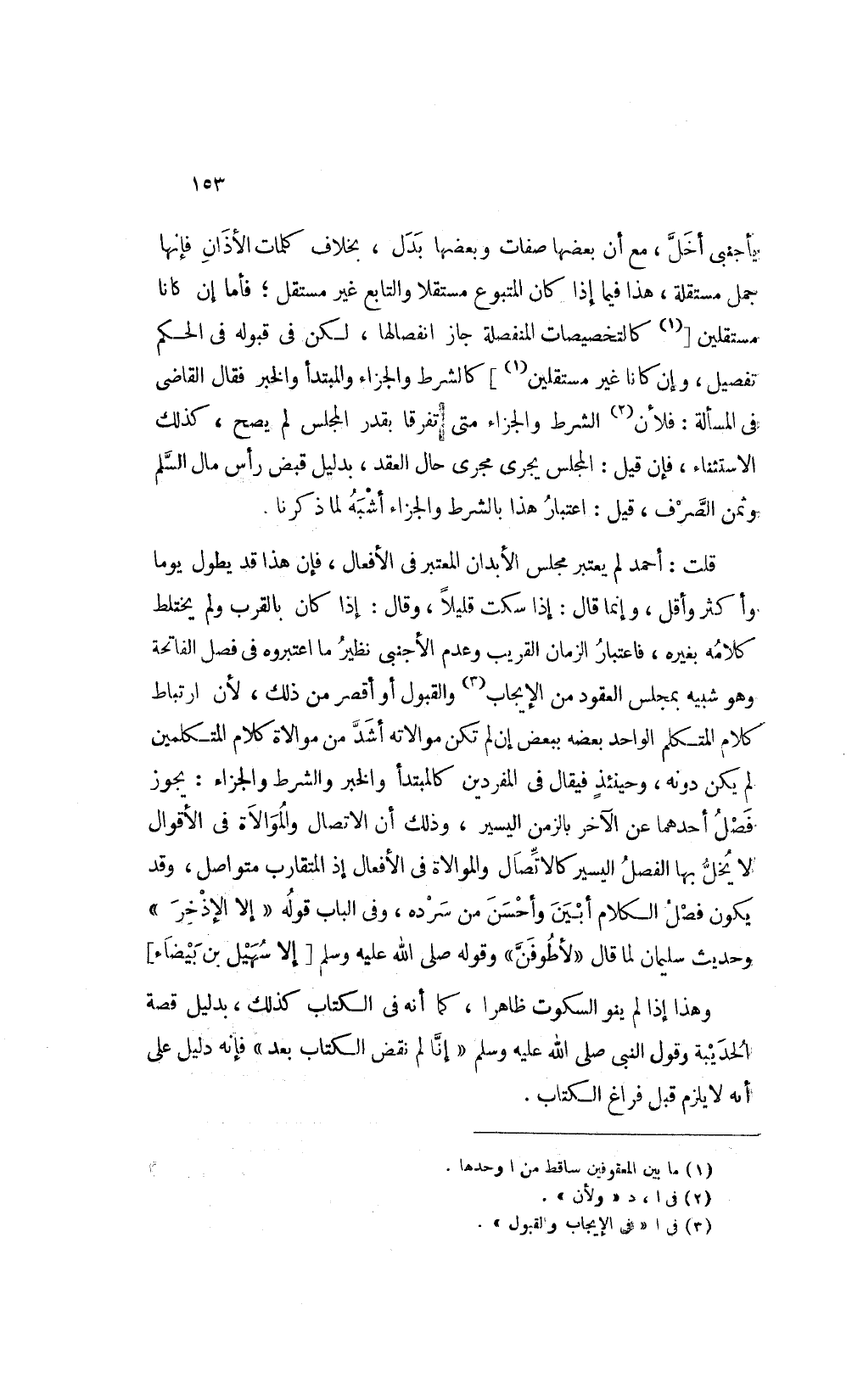 قلت أحمد لم يعتبر مجلس الأبدان المعتبر في الأفعال فإن هذا قد يطول يوما وأكثر وأقل وإنما قال: إذا سكت قليلا وقال إذا كان بالقرب ولم يختلط كلامه بغيره فاعتبار الزمان القريب وعدم الأجنبي نظير ما اعتبروه في فصل الفاتحة وهو شبيه بمجلس العقود من الإيجاب3 والقبول أو أقصر من ذلك لأن ارتباط كلام المتكلم الواحد بعضه ببعض إن لم تكن موالاته أشد من موالاة كلام المتكلمين لم يكن دونه وحينئذ فيقال في المفردين كالمبتدأ والخبر والشرط والجزاء يجوز فصل أحدهما عن الآخر بالزمن اليسير وذلك أن الاتصال والموالاة في الأقوال لا يخل بها الفصل اليسير كالاتصال والموالاة في الأفعال إذ المتقارب متواصل وقد يكون فصل الكلام أبين وأحسن من سرده وفي الباب قوله: "إلا الأذخر" وحديث سليمان لما قال: "لأطوفن" وقوله صلى الله عليه وسلم "إلا سهيل بن بيضاء".