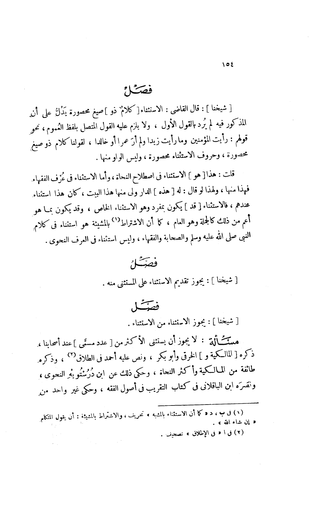 قلت هذا [هو] الاستثناء في اصطلاح النحاة وأما الاستثناء في عرف الفقهاء فهذا منها ولهذا لو قال له [هذه] الدار ولى منها هذا البيت كان هذا استثناء عندهم فالاستثناء [قد] يكون بمفرد وهو الاستثناء الخاص وقد يكون بما هو أعم من ذلك كالجملة وهو العام كما أن الإشتراط1 بالمشيئة هو استثناء في كلام النبي صل الله عليه وسلم والصحابة والفقهاء وليس استثناء في العرف النحوي.