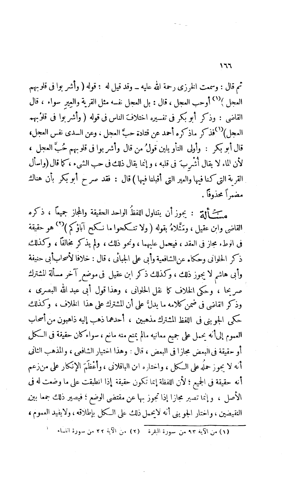 ذكره القاضي وابن عقيل ومثلاه بقوله: {وَلا تَنْكِحُوا مَا نَكَحَ آبَاؤُكُمْ} 1هو حقيقة في الوطء مجاز في العقد فيحمل عليهما ونحو ذلك ولم يذكر مخالفا وكذلك ذكر الحلواني وحكاه عن الشافعية وأبى على الجبائي قال خلافا لأصحاب أبي حنيفة وأبى هاشم: لا يجوز ذلك وكذلك ذكر ابن عقيل في موضع آخر مسألة المشترك صريحا وحكى الخلاف كما نقل الحلواني وهذا قول أبي عبد الله البصري وذكر القاضي في ضمن كلامه ما يدل على أن المشترك على هذا الخلاف وكذلك حكى الجويني في اللفظ المشترك مذهبين أحدهما ذهب إليه ذاهبون من أصحاب العموم إلى أنه يحمل على جميع معانيه ما لم يمنع منه مانع سواء كان حقيقة في الكل أو حقيقة في البعض مجازا في البعض قال: وهذا اختيار الشافعي والمذهب الثاني أنه لا يجوز حمله على الكل واختاره ابن الباقلاني وأعظم الإنكار على من زعم أنه حقيقة في الجميع لأن اللفظة إنما تكون حقيقة إذا انطبقت على ما وضعت له في الأصل وإنما تصير مجازا إذا تجوز بها عن مقتضى الوضع فيصير ذلك جمعا بين النقيضين واختار الجويني أنه لا يحمل ذلك على الكل بإطلاقه ولا يفيد العموم