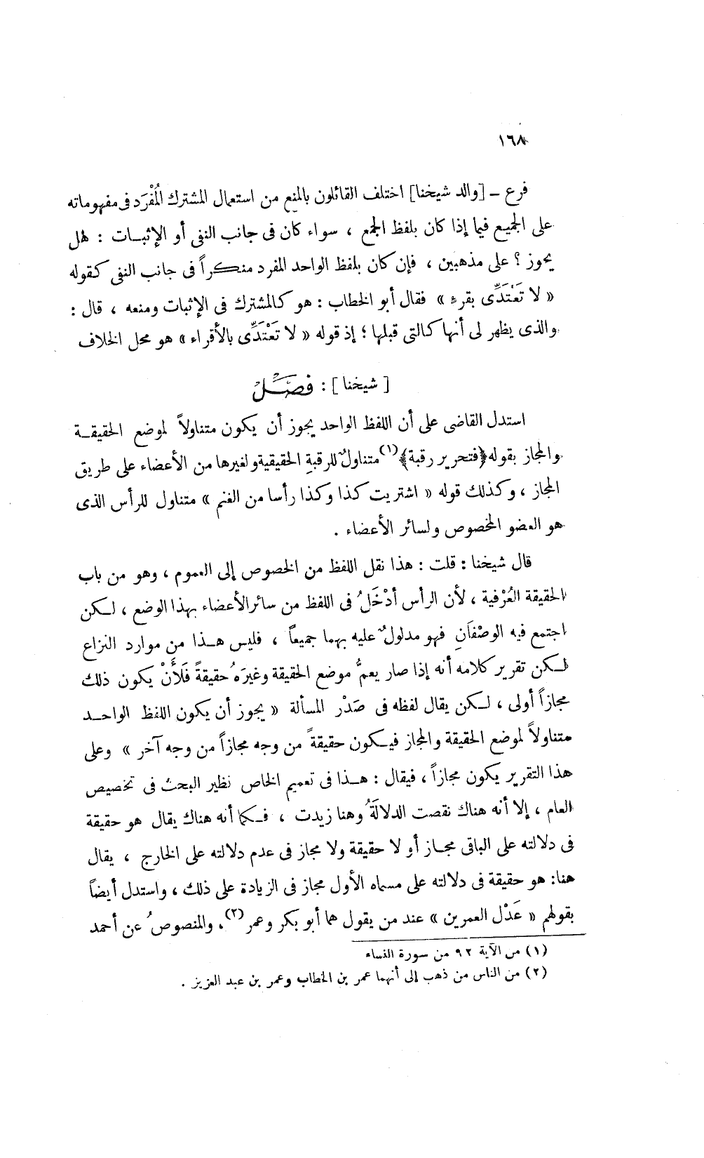 قال شيخنا قلت: هذا نقل اللفظ من الخصوص إلى العموم وهو من باب الحقيقة العرفية لأن الرأس أدخل في اللفظ من سائر الأعضاء بهذا الوضع لكن اجتمع فيه الوصفان فهو مدلول عليه بهما جميعا فليس هذا من موارد النزاع لكن تقرير كلامه أنه إذا صار يعم موضع الحقيقة وغيره حقيقة فلان يكون ذلك مجازا أولى لكن يقال لفظه في صدر المسألة يجوز أن يكون اللفظ الواحد متناولا لموضع الحقيقة والمجاز فيكون حقيقة من وجه مجازا من وجه آخر وعلى هذا التقرير يكون مجازا فيقال هذا في تعميم الخاص نظير البحث في تخصيص العام إلا أنه هناك نقصت الدلالة وهنا زيدت فكما أنه هناك يقال هو حقيقة في دلالته على الباقي مجازا أو لا حقيقة ولا مجاز في عدم دلالته على الخارج يقال هنا هو حقيقة في دلالته على مسماه الأول مجاز في الزيادة على ذلك واستدل أيضا بقولهم عدل العمرين عند من يقول هما أبو بكر وعمر2 والمنصوص عن أحمد