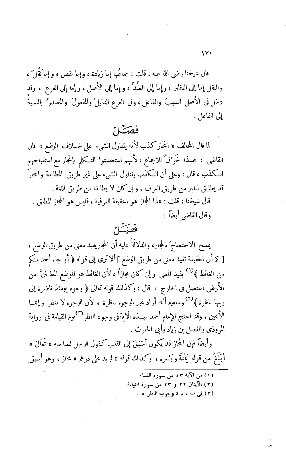 لما قال المخالف: المجاز كذب لأنه يتناول الشيء على خلاف الوضع قال القاضي: هذا خرق للإجماع لأنهم استحسنوا التكلم بالمجاز مع استقباحهم الكذب قال: وعلى أن الكذب يتناول الشيء على غير طريق لمطابقة والمجاز قد يطابق الخبر من طريق العرف وإن كان لا يطابق من طريق اللغة.