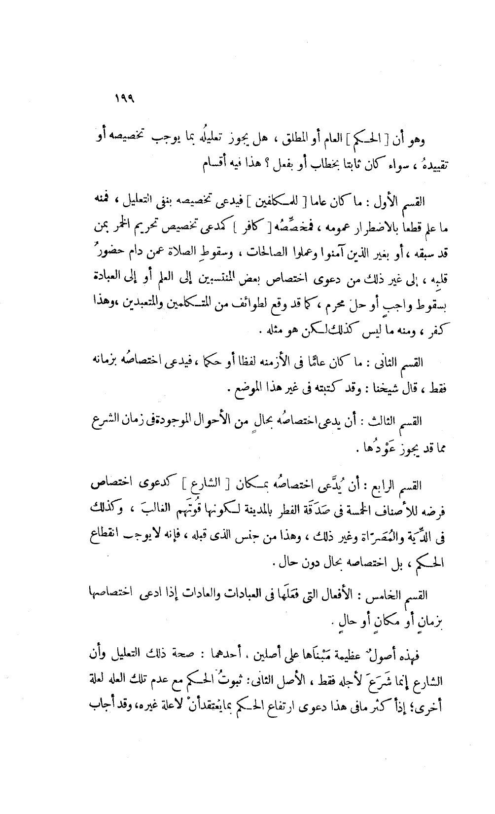 القسم الأول: ما كان عاما [للمكلفين] فيدعى تخصيصه بنفي التعليل فمنه ما علم قطعا بالاضطرار عمومه فمخصصه [كافر] كمدعى تخصيص تحريم الخمر بمن قد سبقه أو بغير الذين آمنوا وعملوا الصالحات وسقوط الصلاة عمن دام حضور قلبه إلى غير ذلك من دعوى اختصاص بعض المنتسبين إلى العلم أو إلى العبادة بسقوط واجب أو حل محرم كما قد وقع لطوائف من المتكلمين والمتعبدين وهذا كفر ومنه ما ليس كذلك لكن هو مثله.