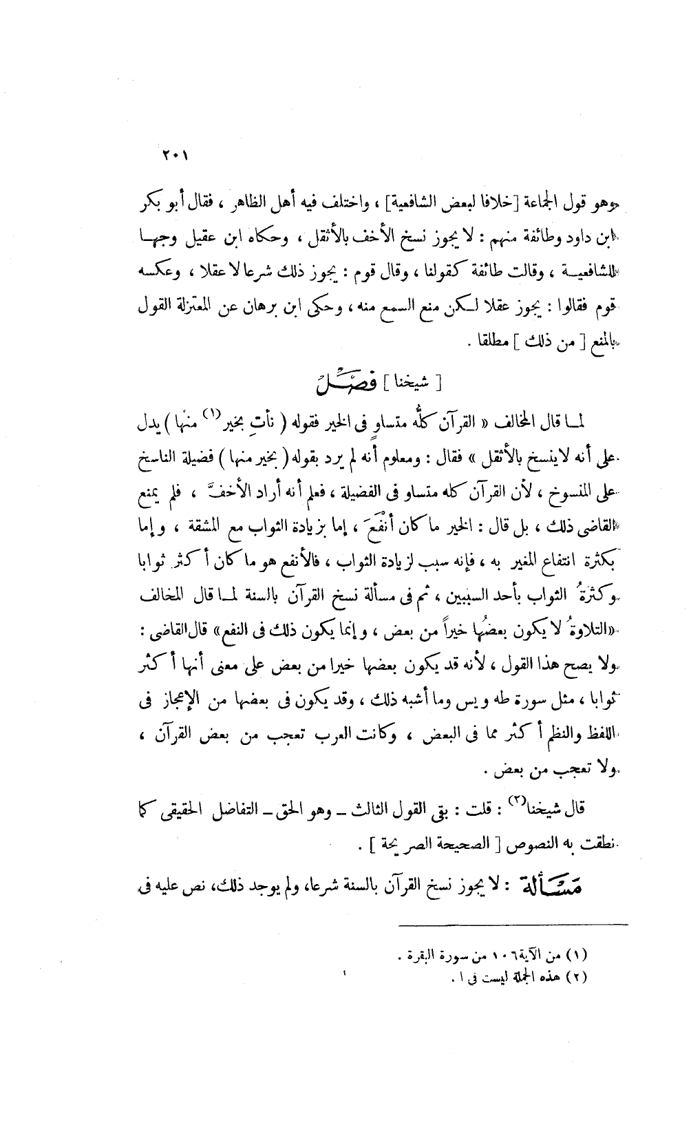 لما قال المخالف: "القرآن كله متساو في الخير فقوله: {نَأْتِ بِخَيْرٍ1 مِنْهَا} يدل على أنه لا ينسخ بالأثقل" فقال ومعلوم أنه لم يرد بقوله: {بِخَيْرٍ مِنْهَا} فضيلة الناسخ على المنسوخ لأن القرآن كله متساو في الفضيلة فعلم أنه أراد الأخف فلم يمنع القاضي ذلك بل قال: الخير ما كان أنفع إما بزيادة الثواب مع المشقة وإما بكثرة انتفاع المغير به فإنه سبب لزيادة الثواب فالأنفع هو ما كان أكثر ثوابا وكثرة الثواب بأحد السببين ثم في مسألة نسخ القرآن بالسنة لما قال المخالف: التلاوة لا يكون بعضها خيرا من بعض وإنما يكون ذلك في النفع قال القاضي: ولا يصح هذا القول لأنه قد يكون بعضها خيرا من بعض على معنى أنها أكثر ثوابا مثل سورة طه ويس وما أشبه ذلك وقد يكون في بعضها من الإعجاز في اللفظ والنظم أكثر مما في البعض وكانت العرب تعجب من بعض القرآن ولا تعجب من بعض.