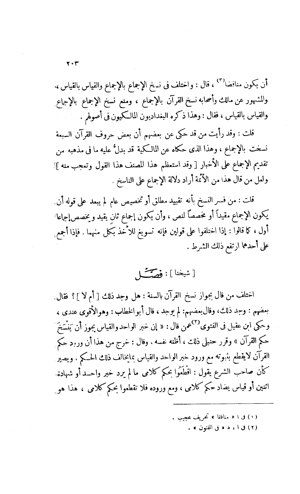 أن يكون مناقضا1 قال: واختلف في نسخ الإجماع بالإجماع والقياس بالقياس والمشهور عن مالك وأصحابه نسخ القرآن بالإجماع ومنع نسخ الإجماع بالإجماع والقياس بالقياس فقال وهذا ذكره البغداديون المالكيون في أصولهم.