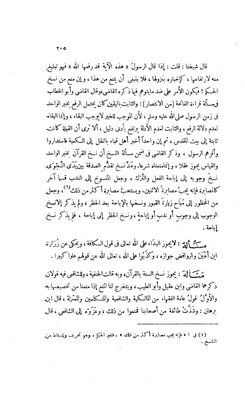 قال شيخنا قلت: إذا قال الرسول هذه الآية قد رفعها الله فهو تبليغ منه لارتفاعها كإخباره بنزولها فلا ينبغي أن يمنع من هذا وأن منع من نسخ الحكم فيكون الأمر على ضد ما يتوهم فيما ذكره القاضي وقال القاضي وأبو الخطاب في مسألة قراءة الفاتحة من الانتصار والثابت باليقين كان يحتمل الرفع بخبر الواحد في زمن الرسول صلى الله عليه وسلم لأن الموجب للخير لا يوجب البقاء وإنما البقاء لعدم دلالة الرفع والثابت لعدم الأدلة يرتفع بأدنى دليل إلا ترى أن القبلة كانت ثابتة إلى بيت المقدس ثم أن واحدا أخبر أهل قباء بالنقل إلى الكعبة فاستداروا وأقرهم الرسول وذكر القاضي في ضمن مسألة النسخ أن نسخ القرآن بخبر الواحد والقياس يجوز عقلا وإنما منعناه شرعا وعد نسخ تقدم الصدقة بين يدي النجوى نسخ وجوبه إلى إباحة الفعل والترك وجعل المنسوخ إلى الندب قسما آخر كالمصابرة فإنه يجب مصابرة الاثنين ويستحب مصابرة أكثر من ذلك1 وجعل من المحظور إلى مباح زيارة القبور ونسخها بالإباحة بعد الحظر ولم يذكر إلا نسخ الوجوب إلى وجوب أو ندب أو إباحة ونسخ الحظر إلى إباحة فلم يذكر نسخ إباحة.