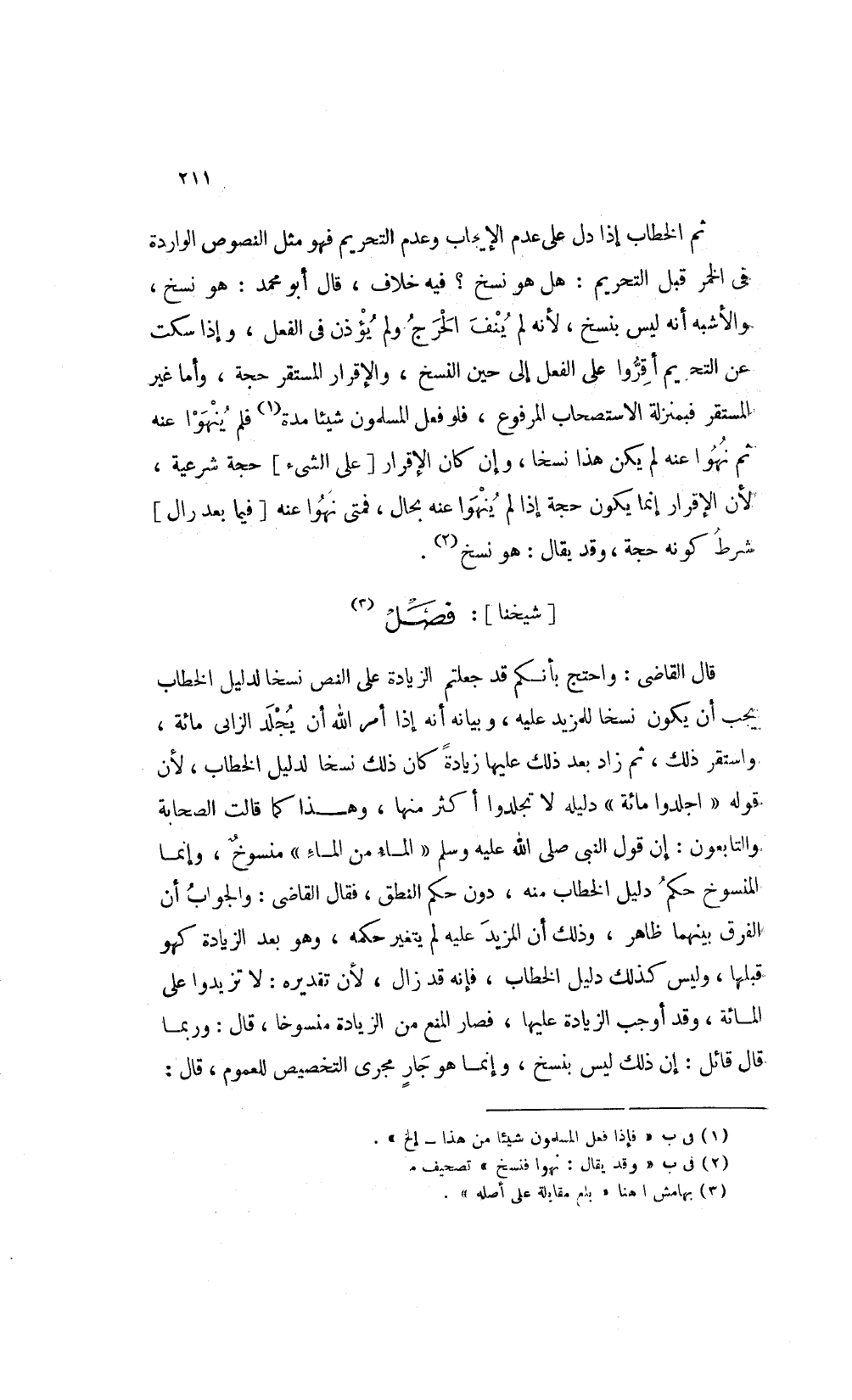ثم الخطاب إذا دل على عدم الإيجاب وعدم التحريم فهو مثل النصوص الواردة في الخمر قبل التحريم هل هو نسخ فيه خلاف قال أبو محمد: هو نسخ والأشبه أنه ليس بنسخ لأنه لم ينف الحرج ولم يؤذن في الفعل وإذا سكت عن التحريم أقروا على الفعل إلى حين النسخ والإقرار المستقر حجة وأما غير المستقر فبمنزلة الاستصحاب المرفوع فلو فعل المسلمون شيئا مدة1 فلم ينهوا عنه ثم نهوا عنه لم يكن هذا نسخا وإن كان الإقرار [على الشيء] حجة شرعية لأن الإقرار إنما يكون حجة إذا لم ينهوا عنه بحال فمتى نهو عنه [فيما بعد زال] شرط كونه حجة وقد يقال هو نسخ2.